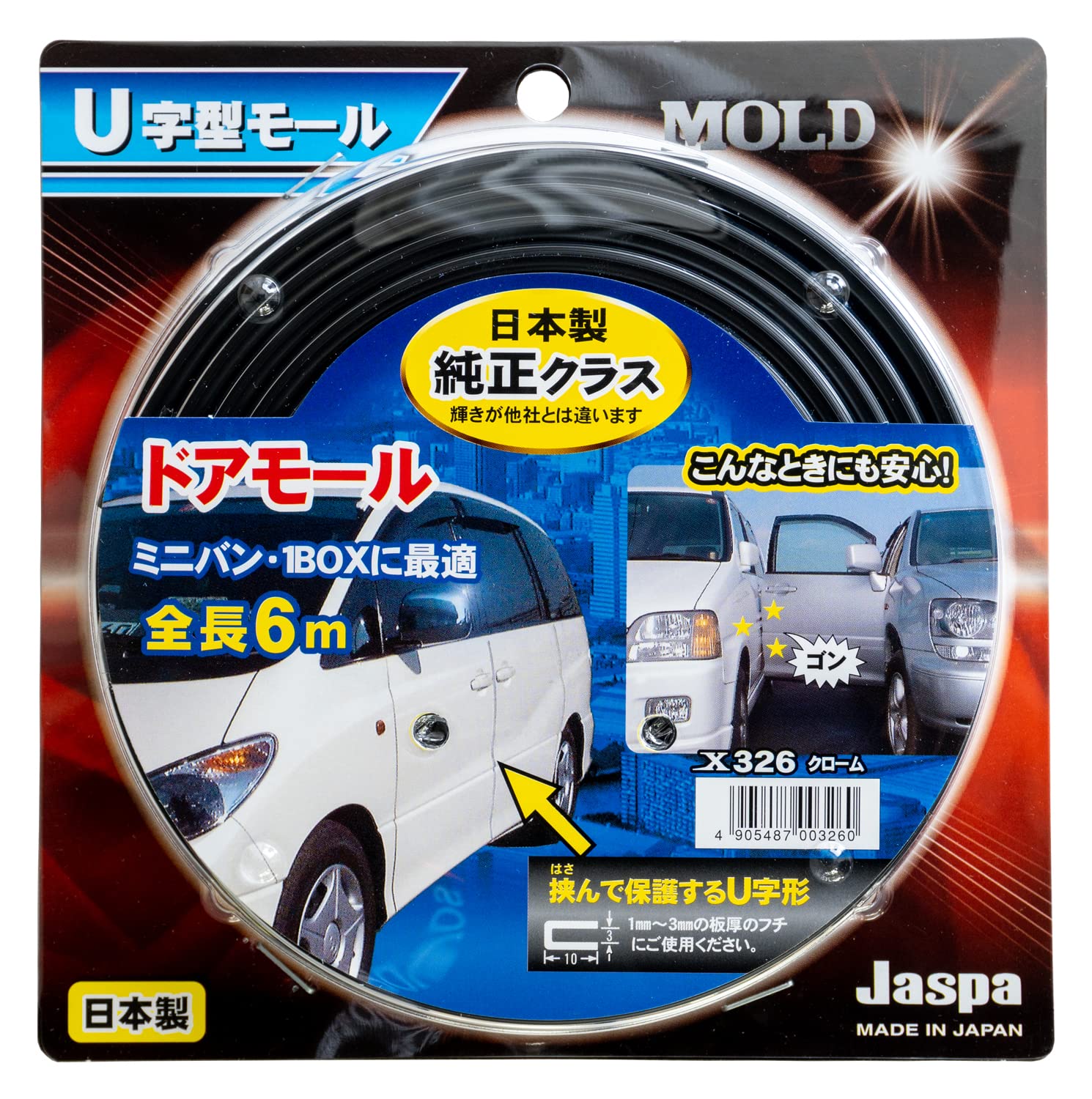 JASPA クリエイト U字型ドアモール 幅10mm 全長6m クローム X326
