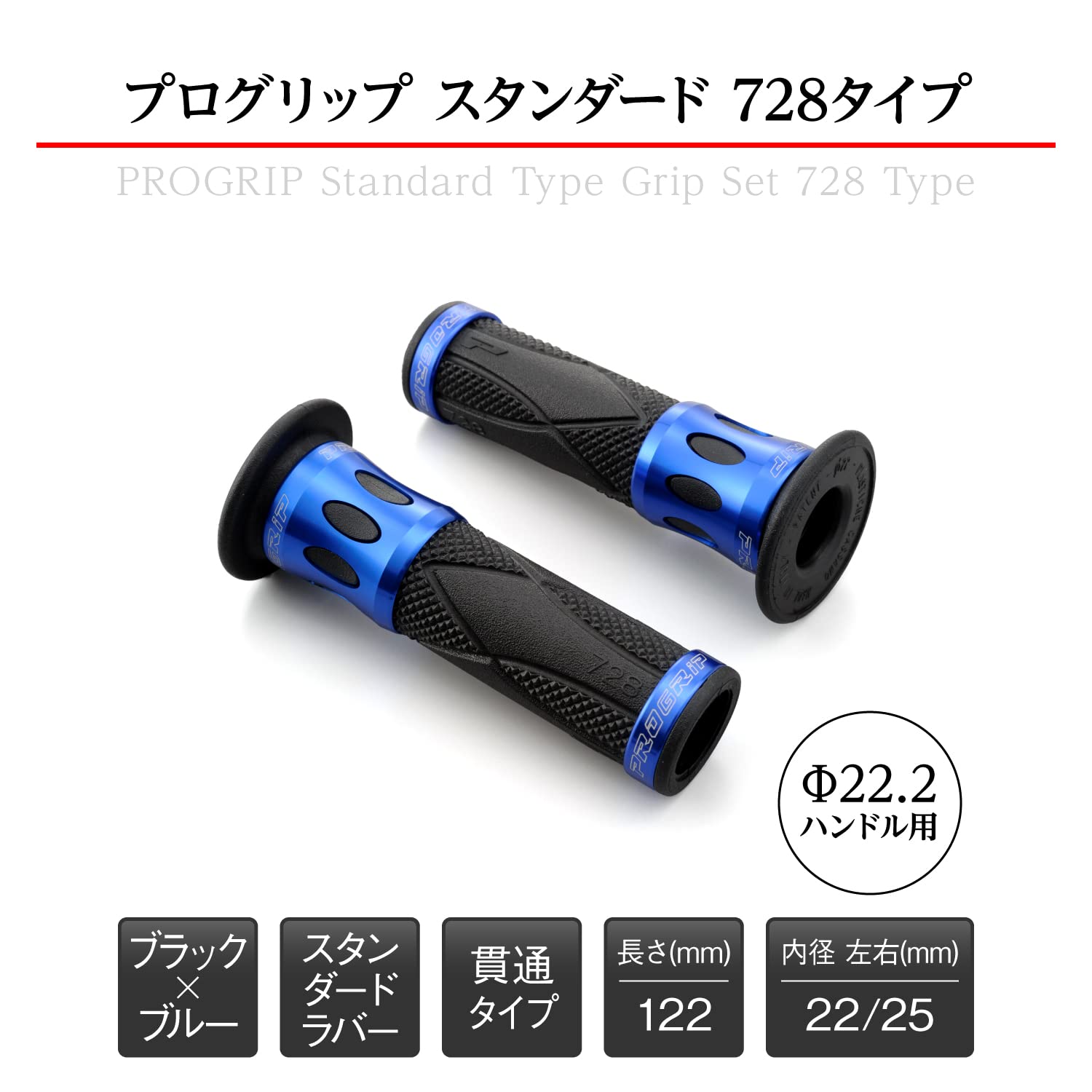 デイトナ(Daytona) PROGRIP(プログリップ) バイク用 グリップ ハンドル径φ22.2用 122mm スタンダードラバー エンド貫通 728タイプ アルミリング ブルー 98088