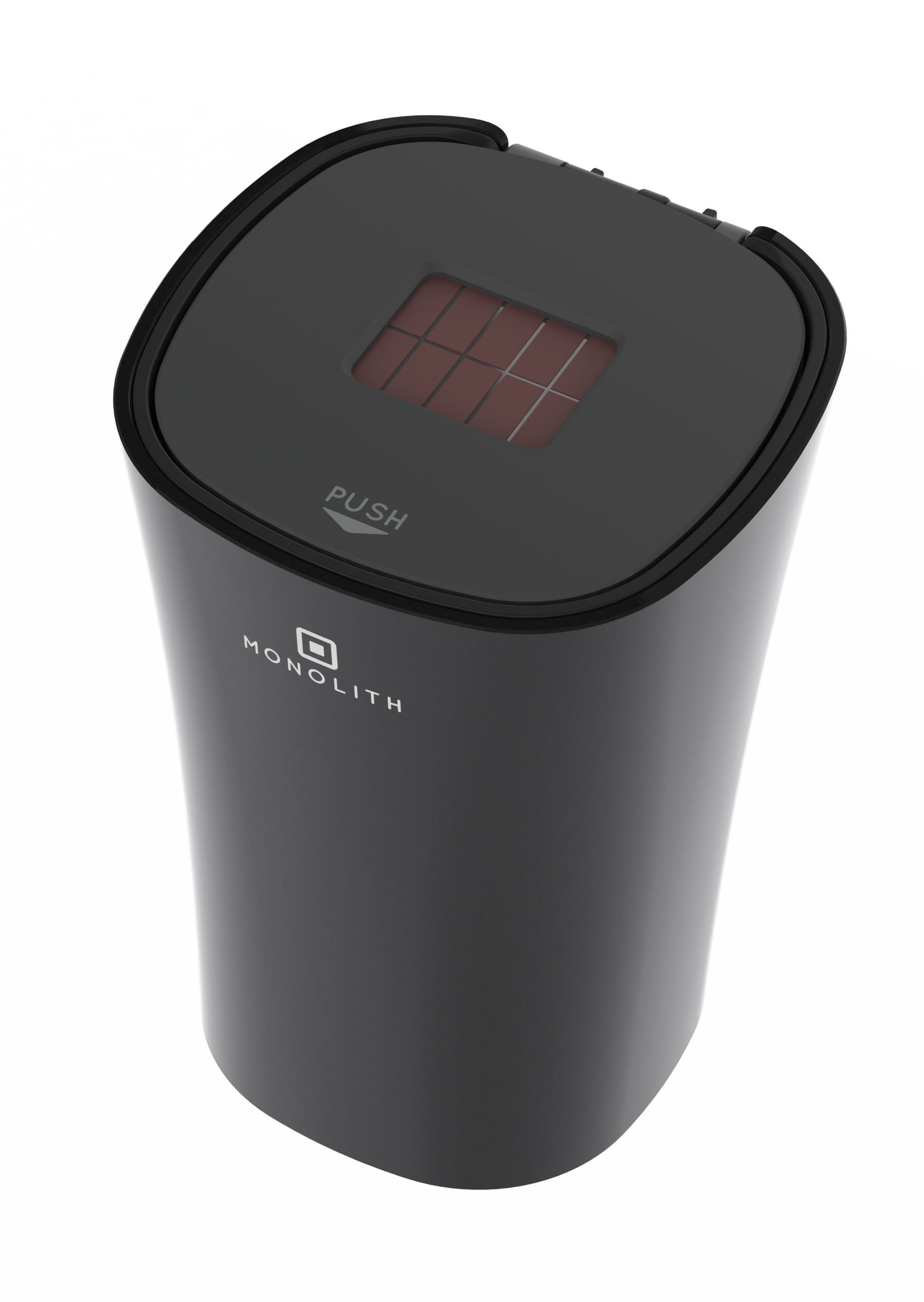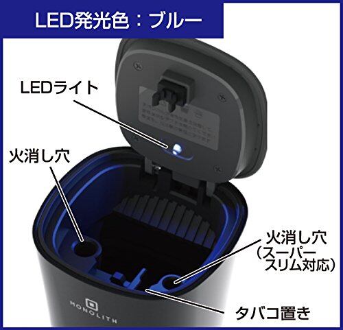 車のドリンクホルダーに収まる灰皿です。フタを押してワンプッシュで開けられます。インテリアになじむシンプル&スタイリッシュデザインです。夜間も見やすく使いやすいソーラーLEDライト付です。火消し穴の清掃ができるクリーニングスティック付。LED発光色:ブルー