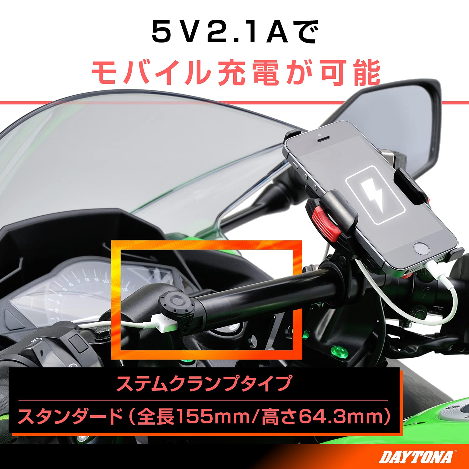 デイトナ(Daytona) バイク用 USB電源&クランプバー USB(5V/2.1A) iPhone/Android対応 ステムクランプ マルチバーUSB電源 スタンダード 155mm 93387