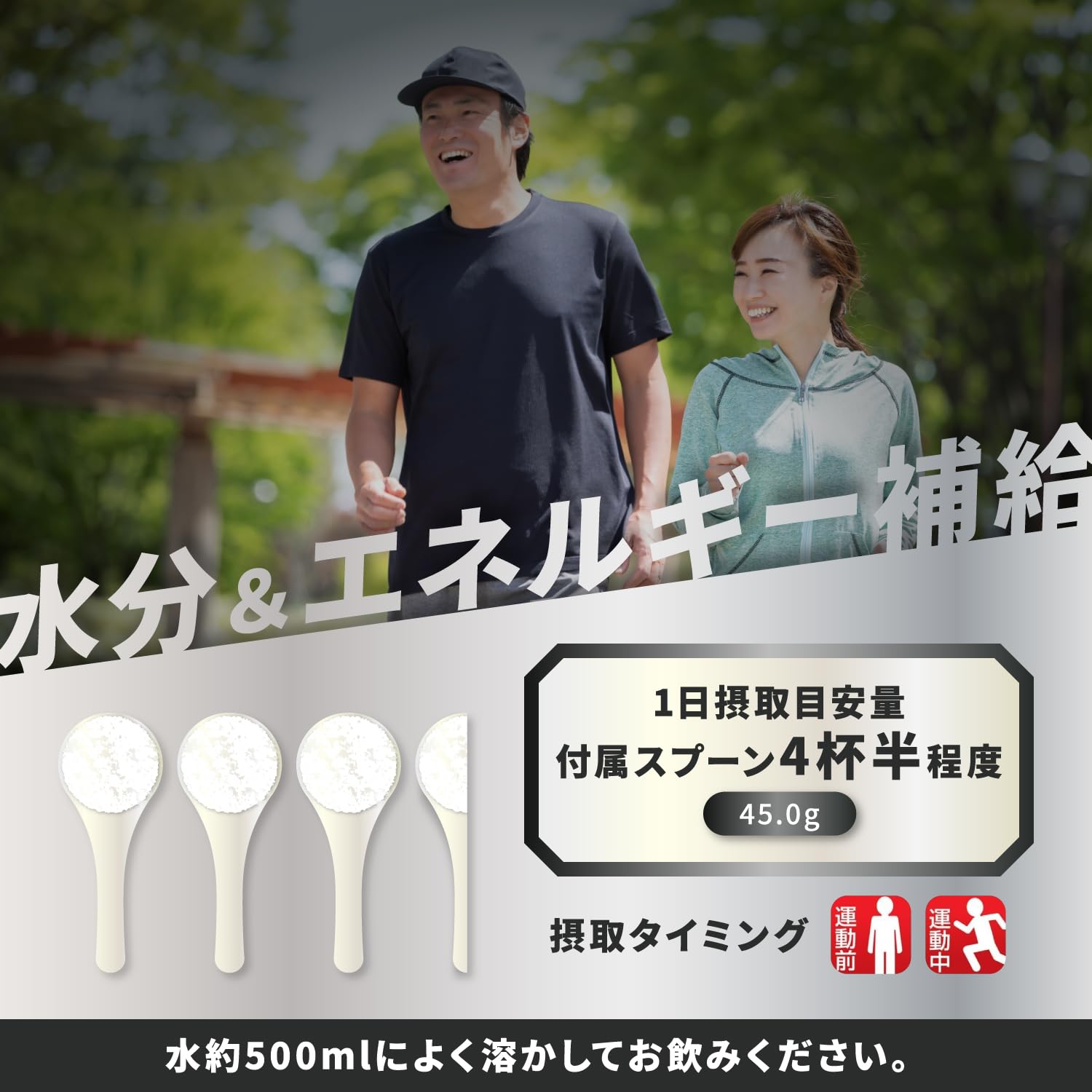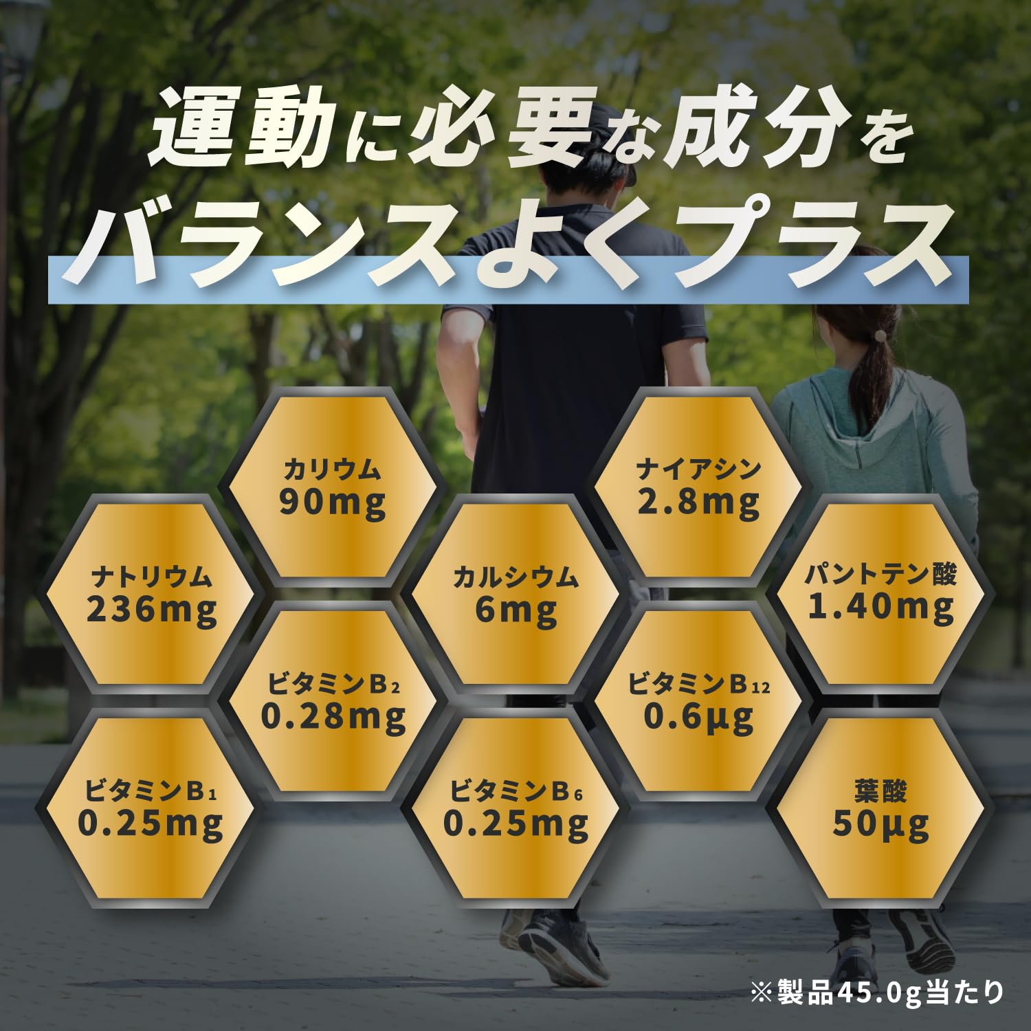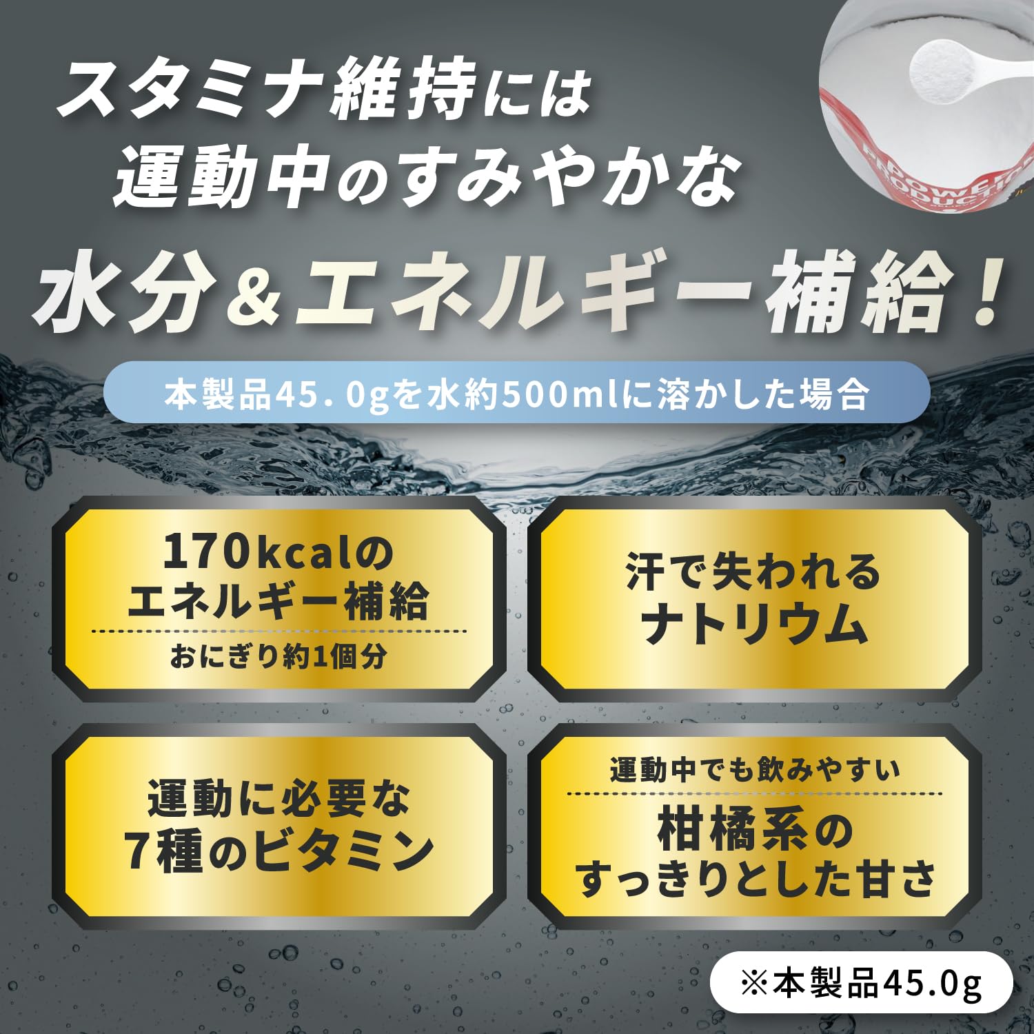 エネルギー&水分補給スタミナを維持するために必要な水分とエネルギーを無理なく摂ることができる粉末ドリンクです。ウォーキングからハードなトレーニングまであらゆる運動中の水分補給におすすめです。おなかに溜まりにくいハイポトニック設計運動時の水分補給において、胃に水分が溜まるとパフォーマンスに影響します。水分がすばやく吸収されるように、体液より低い浸透圧(ハイポトニック)にしています。運動中もすみやかにエネルギー、水分、ナトリウムの補給が可能です。運動時に必要なエネルギーと栄養素を補給500ml(本製品45.0g)あたり170kcalのエネルギー、汗で失われるナトリウムの他、7種のビタミンを補給することができます。運動中でも飲みやすいクリアな味わいです。