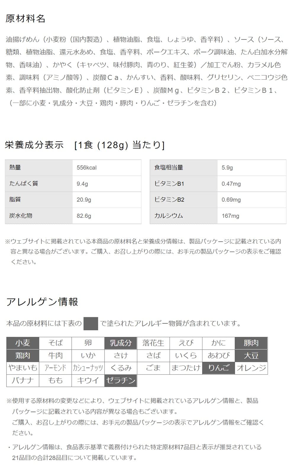 油揚げめん(小麦粉、植物油脂、食塩、しょうゆ、香辛料)、ソース(ソース、糖類、植物油脂、還元水あめ、食塩、香辛料、ポークエキス、ポーク調味油、たん白加水分解物、香味油)、かやく(キャベツ、味付豚肉、青のり、紅生姜)/加工でん粉、カラメル色素、調味料(アミノ酸等)、炭酸Ca、かんすい、香料、酸味料、グリセリン、ベニコウジ色素、香辛料抽出物、酸化防止剤(ビタミンE)、炭酸Mg、ビタミンB2、ビタミンB1、(一部に小麦・乳成分・大豆・鶏肉・豚肉・りんご・ゼラチンを含む)