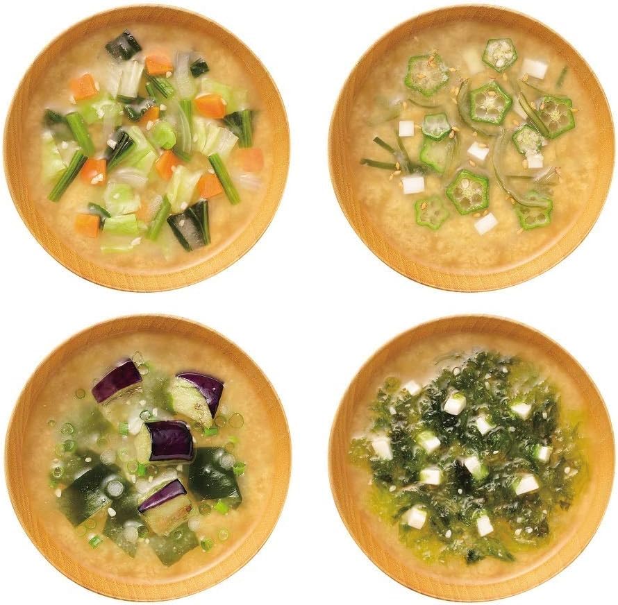 【原材料】なす[揚げなす、米みそ、かつお節エキス、昆布エキス、でん粉分解物、砂糖、わかめ、たん白加水分解物、ねぎ、酵母エキス、かつお節粉末、昆布粉末、いわし煮干粉末、酸化防止剤(V.E)、(原材料の一部に乳を含む)] 野菜[米みそ、たまねぎ、ほうれん草、キャベツ、かつお節エキス、でん粉分解物、昆布エキス、砂糖、人参、野菜ペースト、たん白加水分解物、酵母エキス、かつお節粉末、昆布粉末、いわし煮干粉末、酸化防止剤(V.E)、(原材料の一部に乳を含む)] オクラとめかぶ[米みそ、おくら、昆布エキス、でん粉分解物、かつお節エキス、砂糖、とうふ、乳糖、めかぶ、ごま、たん白加水分解物、ねぎ、ゼラチン、酵母エキス、かつお節粉末、昆布粉末、いわし煮干粉末、酸化防止剤(V.E)、凝固剤、(原材料の一部に乳を含む)] あおさ[米みそ、でん粉分解物、昆布エキス、かつお節エキス、砂糖、とうふ、ひとえぐさ、たん白加水分解物、酵母エキス、ゼラチン、かつお節粉末、昆布粉末、いわし煮干粉末、凝固剤、酸化防止剤(V.E)、(原材料の一部に乳を含む)]
