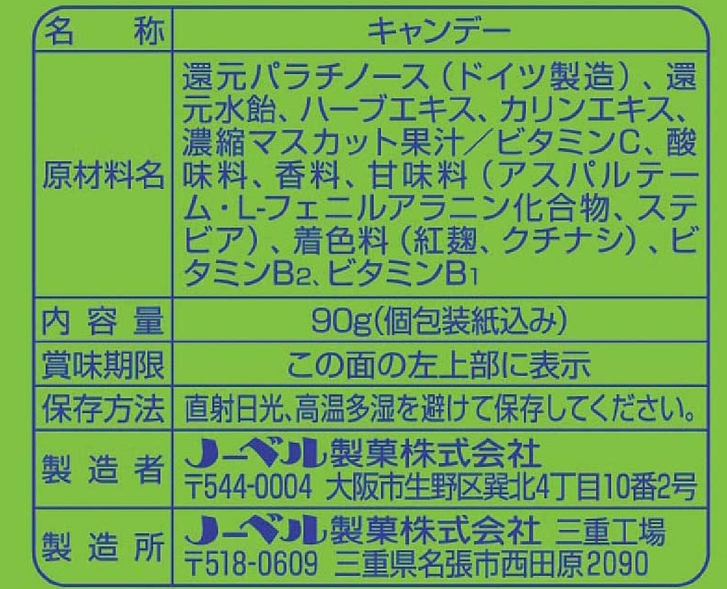 原材料:還元パラチノース、還元水飴、ハーブエキス、カリンエキス、濃縮マスカット果汁、ビタミンC、酸味料、香料、甘味料(アスパルテーム・L-フェニルアラニン化合物、ステビア)、着色料(紅麹、クチナシ)、ビタミンB2、ビタミンB1