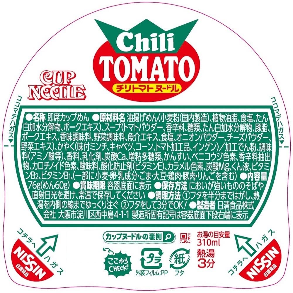 油揚げめん(小麦粉、植物油脂、食塩、たん白加水分解物、ポークエキス)、スープ(トマトパウダー、香辛料、糖類、たん白加水分解物、豚脂、ポークエキス、香味調味料、野菜調味料、魚介エキス、食塩、オニオンパウダー、チーズパウダー、野菜エキス)、かやく(味付ミンチ、キャベツ、コーン、トマト加工品、インゲン)/加工でん粉、調味料(アミノ酸等)、香料、乳化剤、炭酸Ca、増粘多糖類、かんすい、ベニコウジ色素、香辛料抽出物、カロチノイド色素、酸味料、酸化防止剤(ビタミンE)、カラメル色素、炭酸Mg、くん液、ビタミンB2、ビタミンB1、(一部に小麦・卵・乳成分・ごま・大豆・鶏肉・豚肉・りんごを含む)