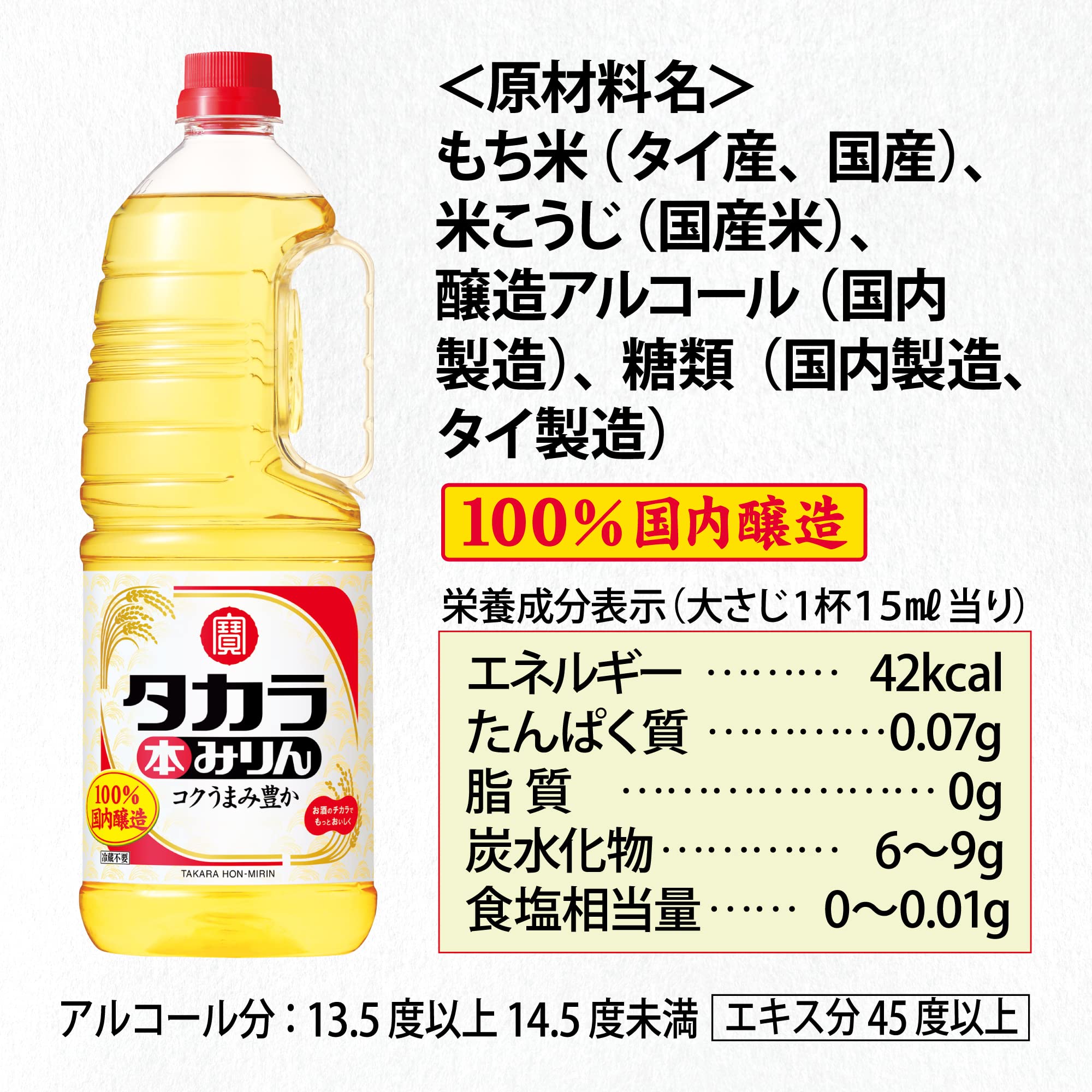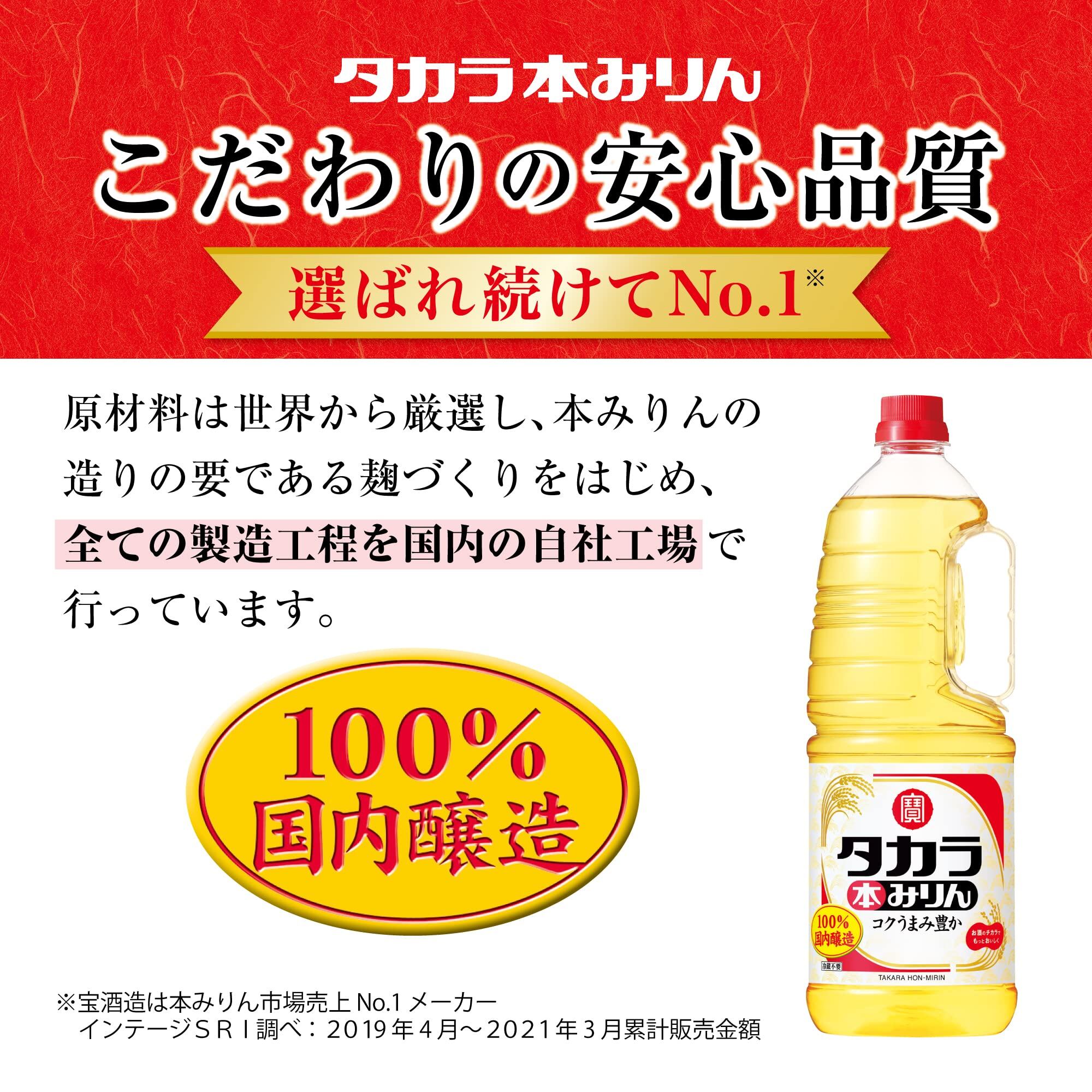 原材料は広く世界から厳選して調達したうえで、本みりん造りの要である麹づくりをはじめ、仕込み・熟成・充填に至るまでの全ての製造工程を国内の自社工場で行っています。タカラ本みりんの調理効果はそのままに、お値打ち価格を実現。米から生まれるアミノ酸を豊富に含み、料理にコクとうまみを与える効果にすぐれています。