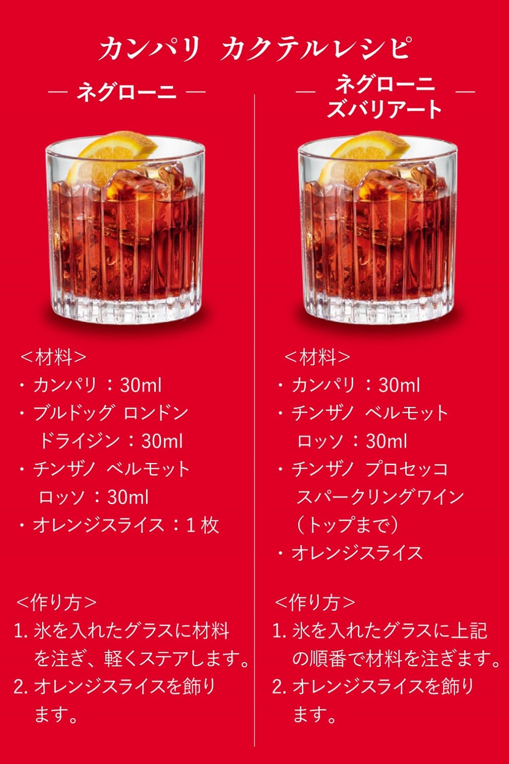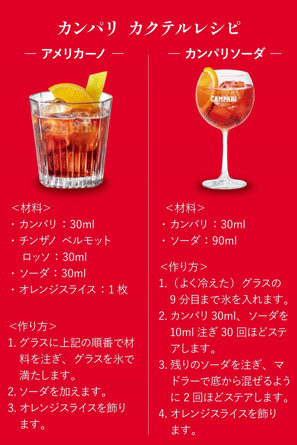 今や世界190カ国で愛飲されている、数多くのハーブを使ったイタリア生まれの赤いハーブリキュール。本場ミラノではアペリティーヴォ(アペリティフ)タイムの仲間と会話を楽しむひと時に欠かせない飲み物となっています。オレンジジュースやソーダ、トニックウォーターの相性がよく、食前・食中にもオススメです。