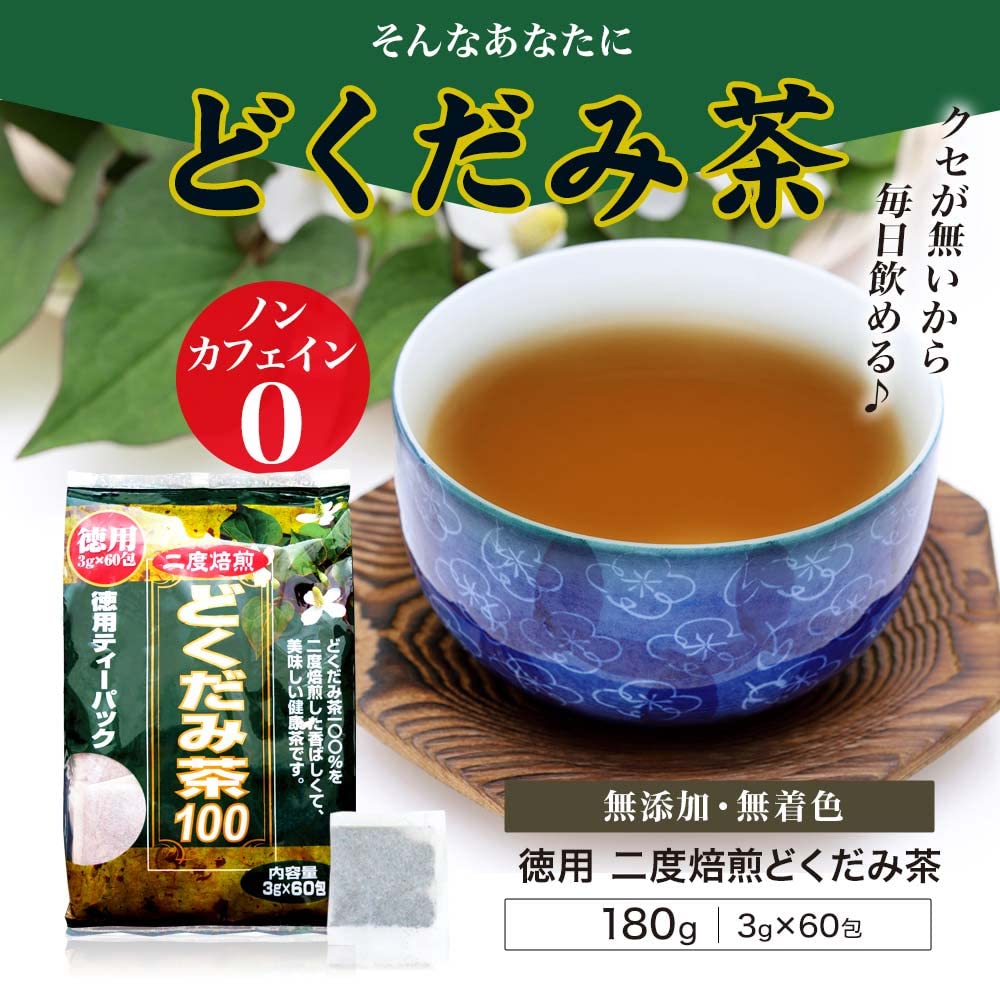 本品は、どくだみを100%使用し、独自の二度焙煎法により、味・香りをそのままに美味しくお召し上がれる健康茶です。