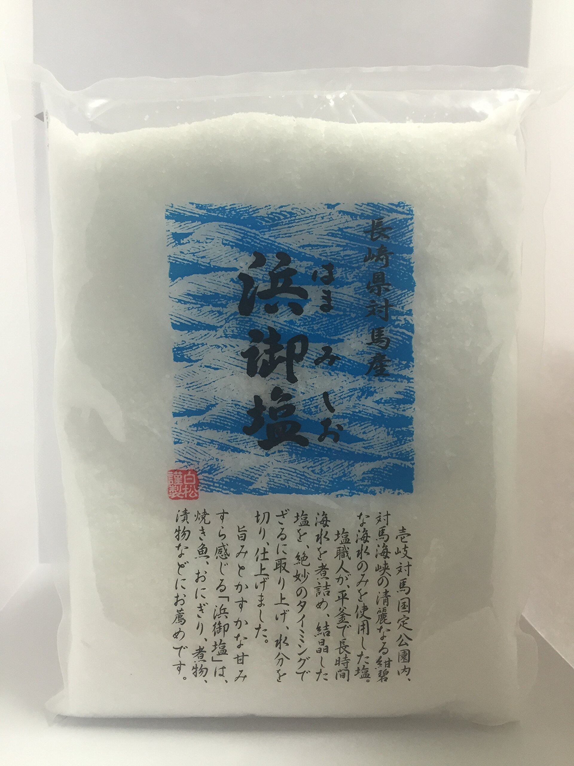 ◆「浜御塩」は、塩職人によるこだわりの海水平釜炊きのお塩です。 長崎県対馬の海岸は、壱岐対馬国定公園に認定され、天然の海藻が生い茂る清麗なる海水に恵まれています。「浜御塩」は、この対馬海流の海水を汲み上げ、濃縮・結晶化させて塩作りを行なっています。 まず最初に、汲み上げた海水を、逆浸透膜を利用した海水濃縮設備で濃度を上げます。次に天日と風の力を利用したネット噴霧式の海水濃縮設備で海水の濃度を上げていきます。さらに、塩職人が平釜で一昼夜煮つめながら塩の結晶化をさせます。結晶化した塩を絶妙のタイミングで、丁寧にざるに取り上げ、水分を切り、仕上げました。 ◆しっとりしたタイプの粗塩で、和食全般にお薦めです。 旨味とかすかな甘味すら感じる「浜御塩」は、和食全般にお薦めです。特に、焼き魚、おにぎり、煮物、漬物などにお薦めです。