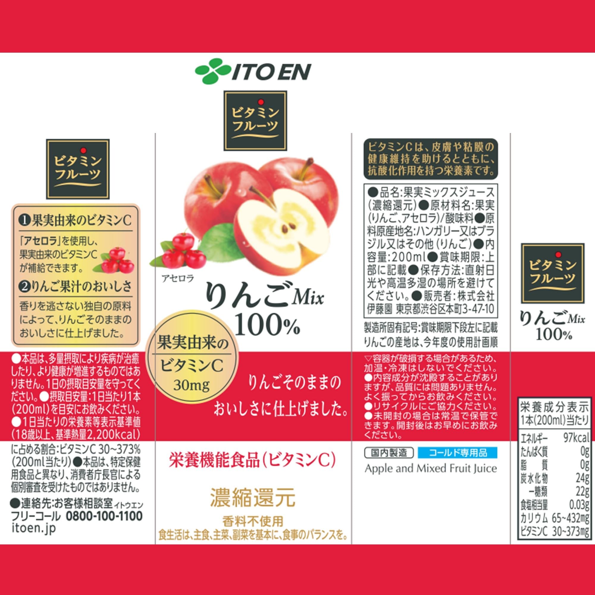 栄養成分(1本(200ml)当たり):エネルギー 97kcal、たんぱく質 0g、脂質 0g、炭水化物 24g (糖類 22g)、食塩相当量 0.03g、カリウム 65~432mg、ビタミンC 30~373mg ※糖類は主に果実に由来します。