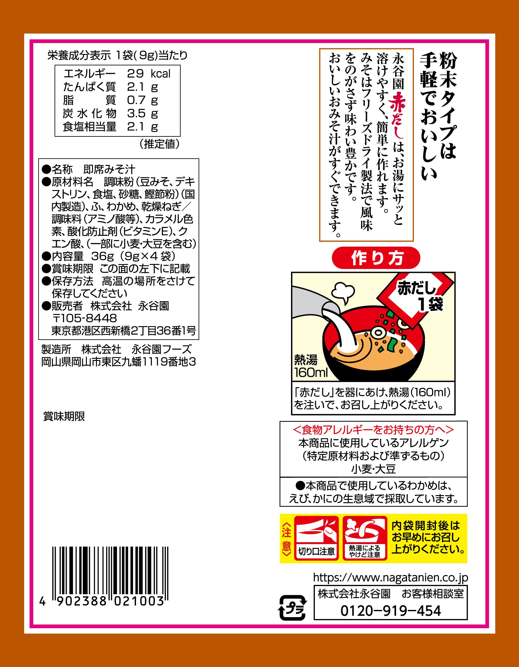 原材料:豆みそ、デキストリン、食塩、砂糖、ふ(小麦を含む)、わかめ、鰹節粉、ねぎ、調味料(アミノ酸等)、カラメル色素、酸化防止剤(ビタミンE)、クエン酸