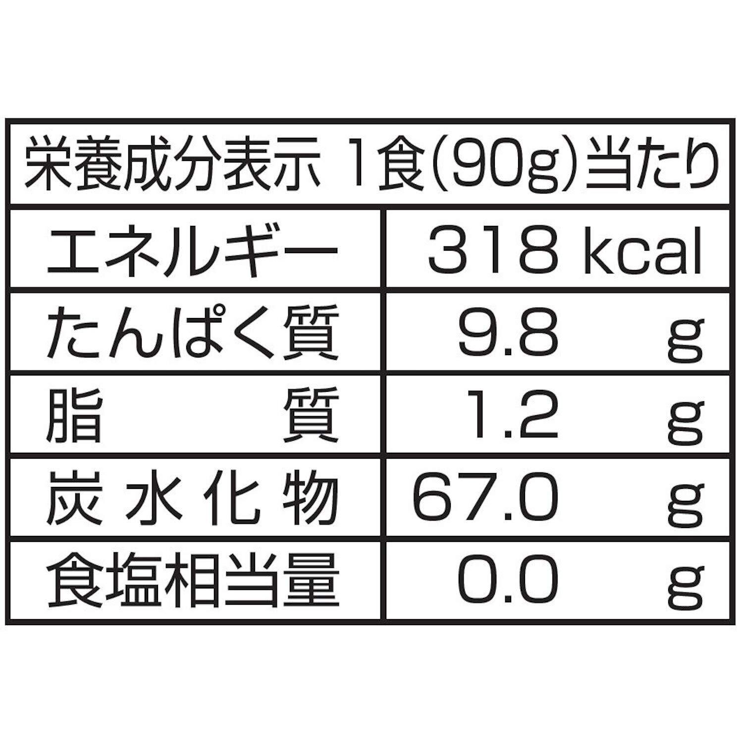 栄養成分表示1食(90g)当たり エネルギー318kcal たんぱく質9.8g 脂質1.2g 炭水化物67.0g 食塩相当量0.0g