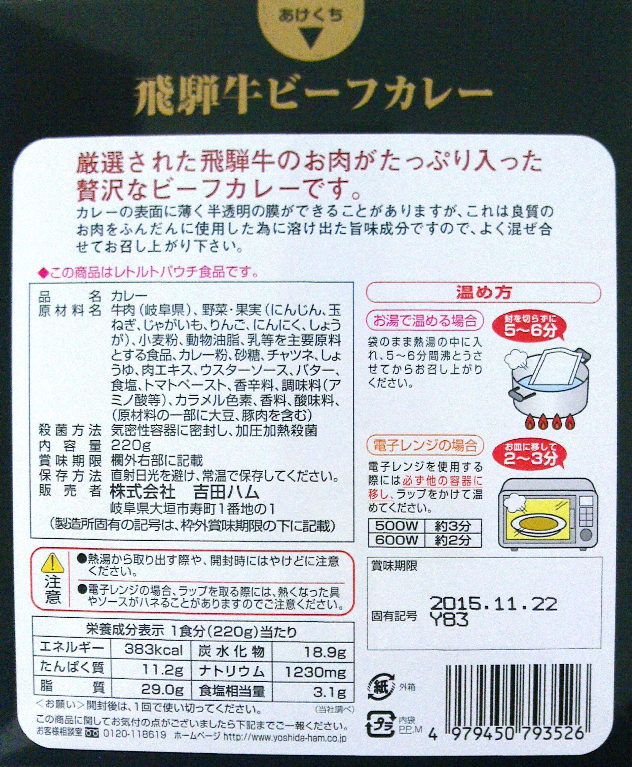 原材料:牛肉、野菜(たまねぎ、じゃがいも、にんじん、しょうが、にんにく)、小麦粉、ラード、砂糖、カレー粉、食塩、チャツネ、リンゴピューレ、トマトペースト、醬油、乳等を主原材料とする食品、ビーフエキス、ウスターソース、調味料(アミノ酸等)、着色料(カラメル)、香料(原材料に一部乳、豚肉を含む)