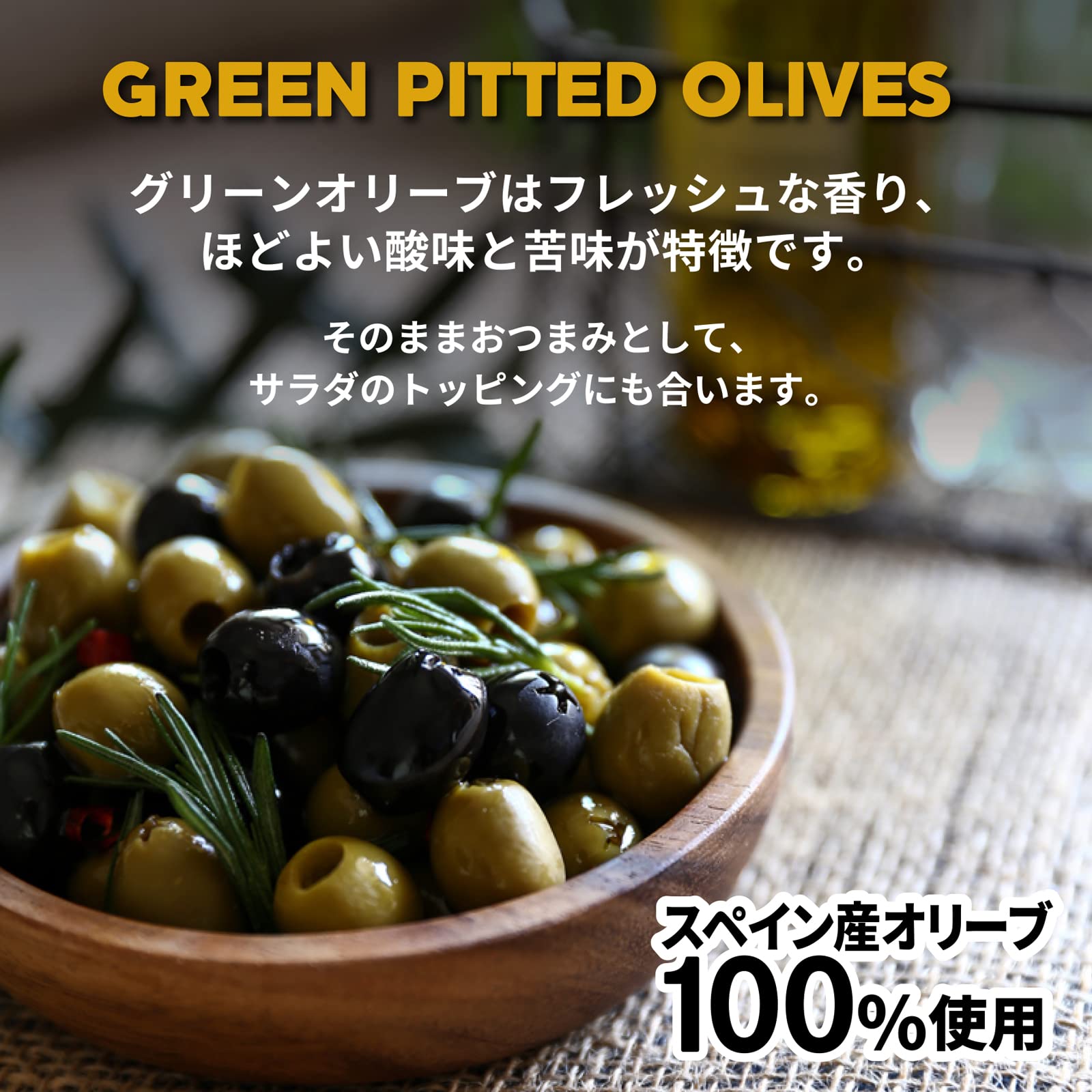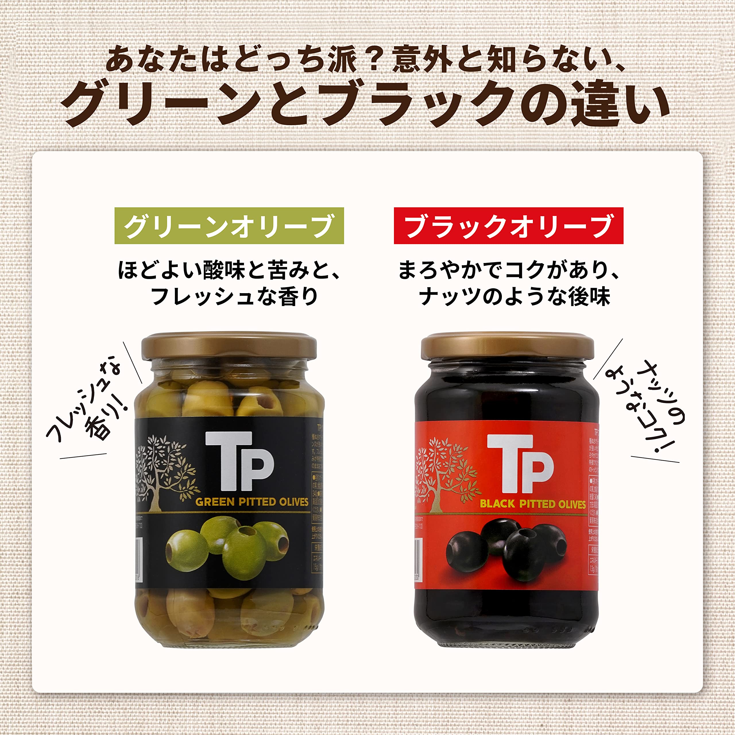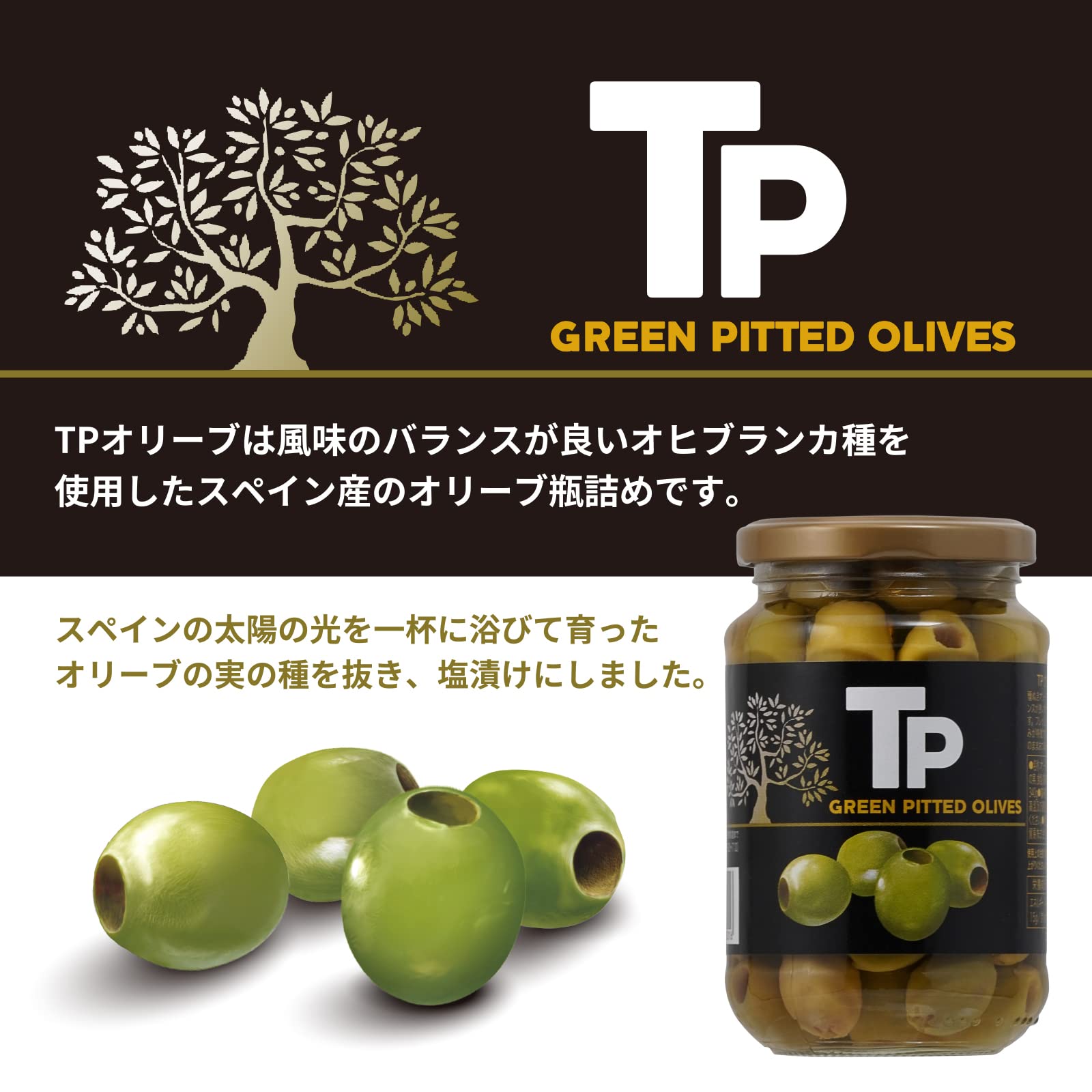 TPオリーブは風味のバランスが良いオヒブランカ種を使用したスペイン産のオリーブ瓶詰めです。スペインの太陽の光を一杯に浴びて育ったオリーブの実の種を抜き、塩漬けにしました。グリーンオリーブはフレッシュな香り、ほどよい酸味と苦味が特徴。