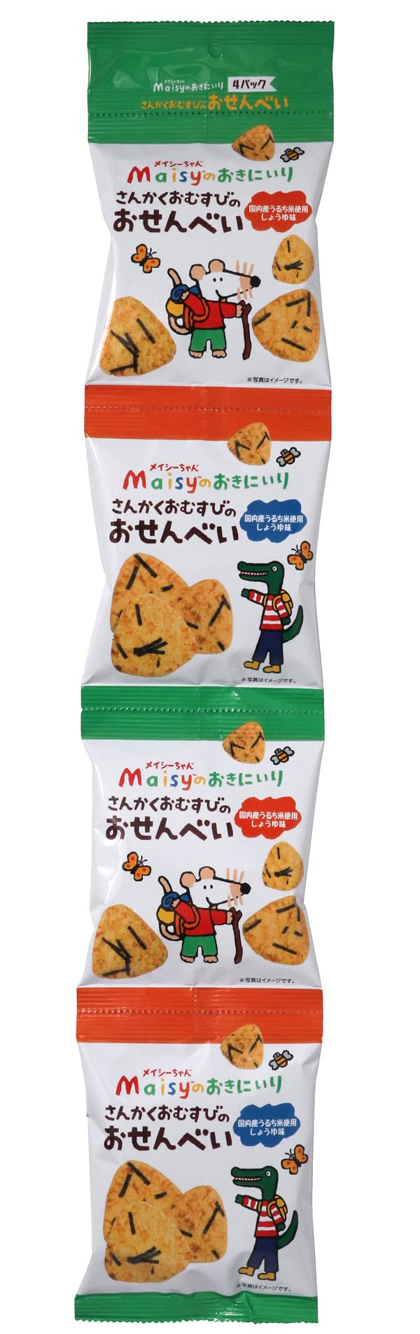 メイシーちゃんのおきにいりシリーズは原材料のもつ自然なおいしさにこだわりました。さんかくおむすびの形をした、サクッと香ばしいしょうゆ味のおせんべいをほんのりかつお味で仕上げました。国内産うるち米、国内産丸大豆を使った醤油、北海道産てんさいから作った砂糖使用。食べ切りサイズの14g×4連タイプ。メイシーちゃんといっしょに楽しいおやつタイム! 対象年齢(目安):1歳半頃から。