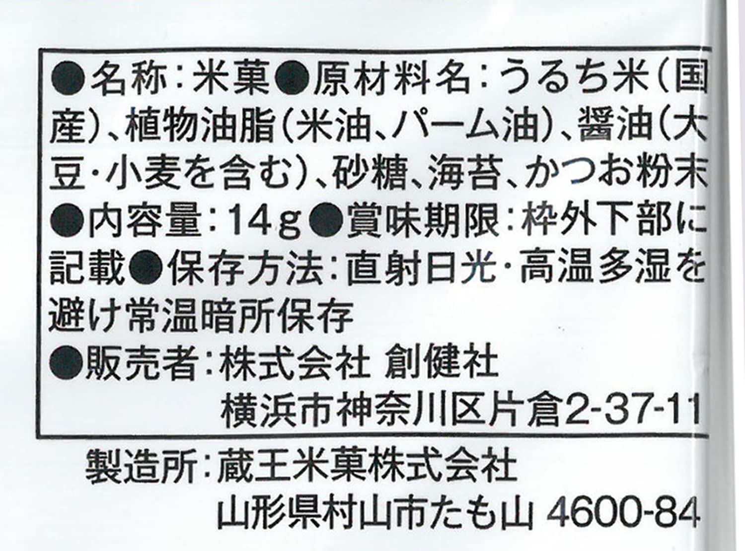 原材料:うるち米(北海道、青森、秋田、岩手、山形、宮城)、植物油脂[米油(国内産)、パーム油(マレーシア)]、醤油[大豆(国内産)、小麦(アメリカ)を含む]、砂糖[てんさい(北海道)]、海苔(瀬戸内)、かつお粉末(中西部太平洋、インド洋)