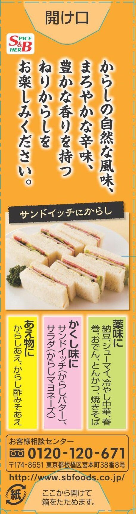 【薬味に】納豆、シューマイ、冷やし中華、春巻、おでん、とんかつ、焼きそば 【下味に】サンドイッチ(からしバター)、サラダ(からしマヨネーズ) 【あえ物に】からしあえ、からし酢みそあえ(裏面写真上のレシピ訴求は、「サンドイッチにからし」、「マヨネーズディップにからし」、「とんかつ にからし」、「焼きそばにからし」の4種類のいずれか)