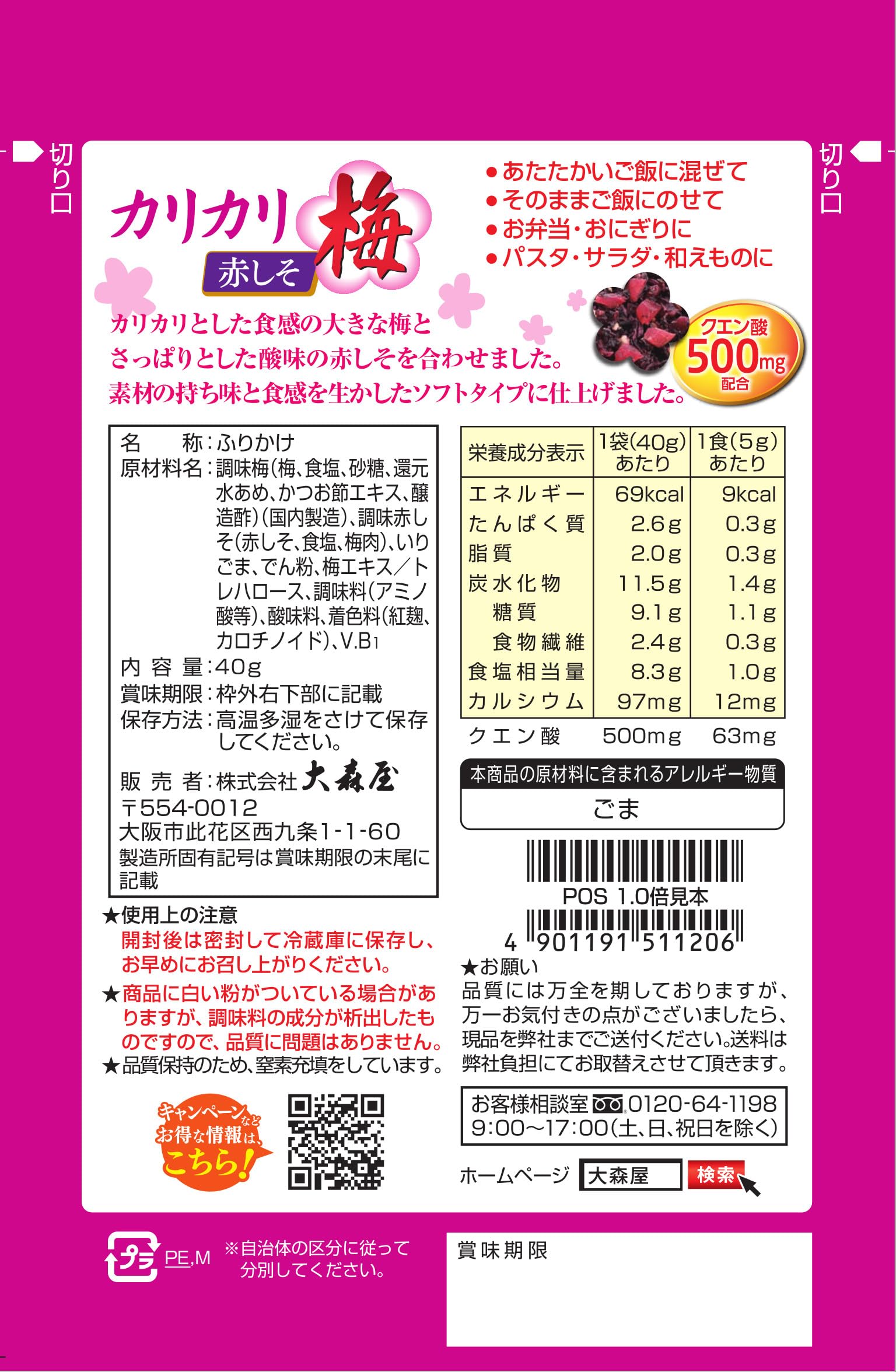原材料:梅(中国産)、赤しそ、食塩、ごま、砂糖、でん粉、梅エキス、梅肉、還元水あめ、かつお節エキス、醸造酢/トレハロース、調味料(アミノ酸等)、酸味料、着色料(紅麹、カロチノイド)、V.B1
