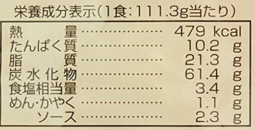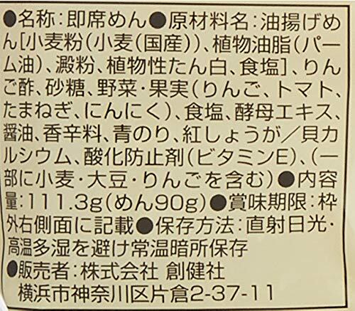 原材料:油揚げめん[小麦粉(北海道、岩手)、植物油脂(パーム油)、澱粉(国内産馬鈴薯)、植物性たん白(小麦グルテン)、食塩]、りんご酢、砂糖(さとうきび粗糖)、野菜・果実(りんご・トマト・玉ねぎ・にんにく)、食塩(地中海の天日塩:イタリア)、酵母エキス、醤油(大豆・小麦を含む)、香辛料、青のり、紅しょうが、貝カルシウム(カキ殻:北陸、北海道)、酸化防止剤(ビタミンE)