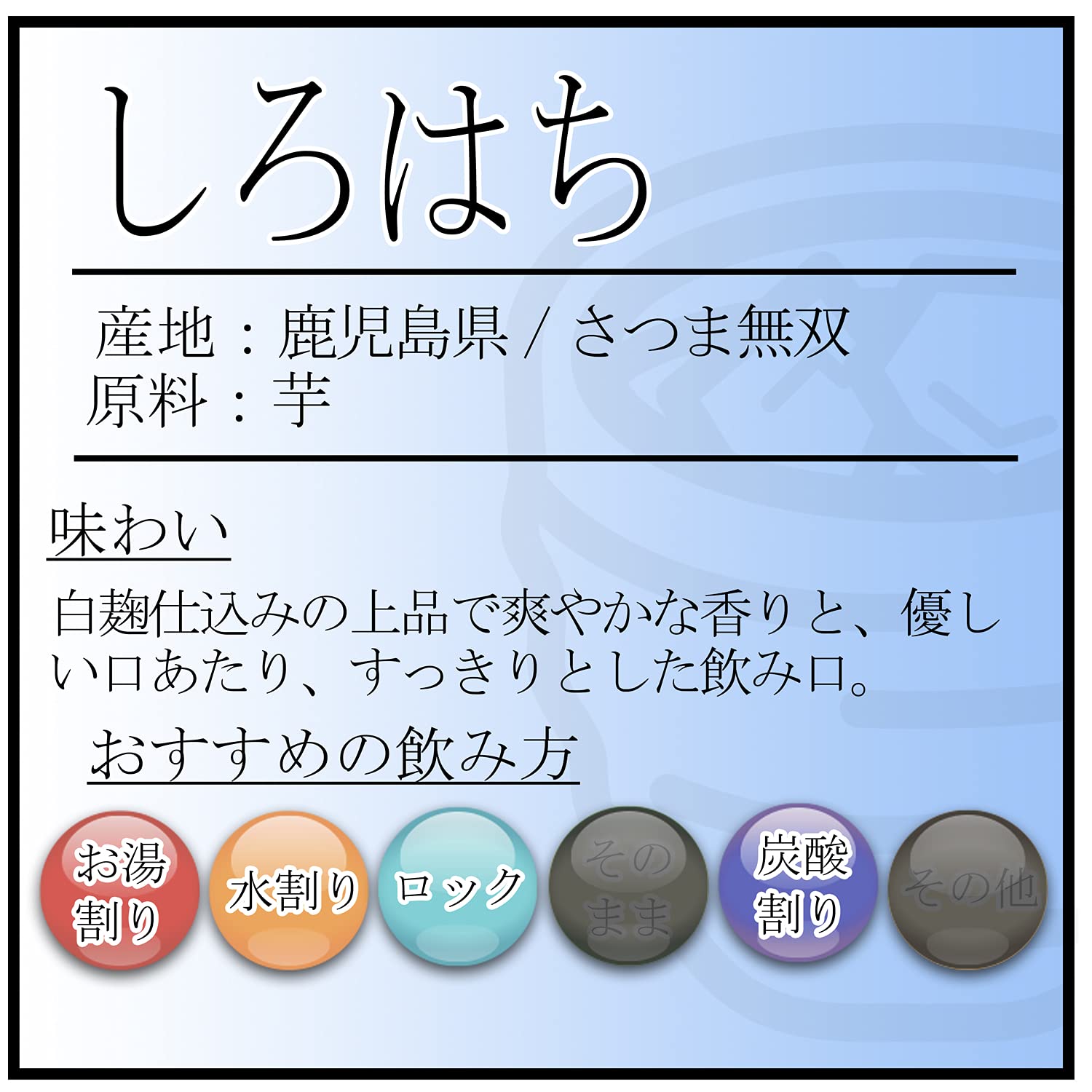 白麹仕込みから生み出された上品で爽やかな香りと、優しい口あたり、すっきりとした飲み口が特徴の本格麦焼酎です。焼酎造りにとって重要な割り水は、悠久の時を経て得られる大自然の恵み、薩摩の湧水を使用しています。この七窪湧水を汲み、会社敷地内にある木槽受水槽に貯水しております。木槽受水槽は断熱性・抗菌性に優れ温度も安定させる為、水質を維持する事ができ、焼酎造りに欠かせないまろやかな美味しい水を造りだします。