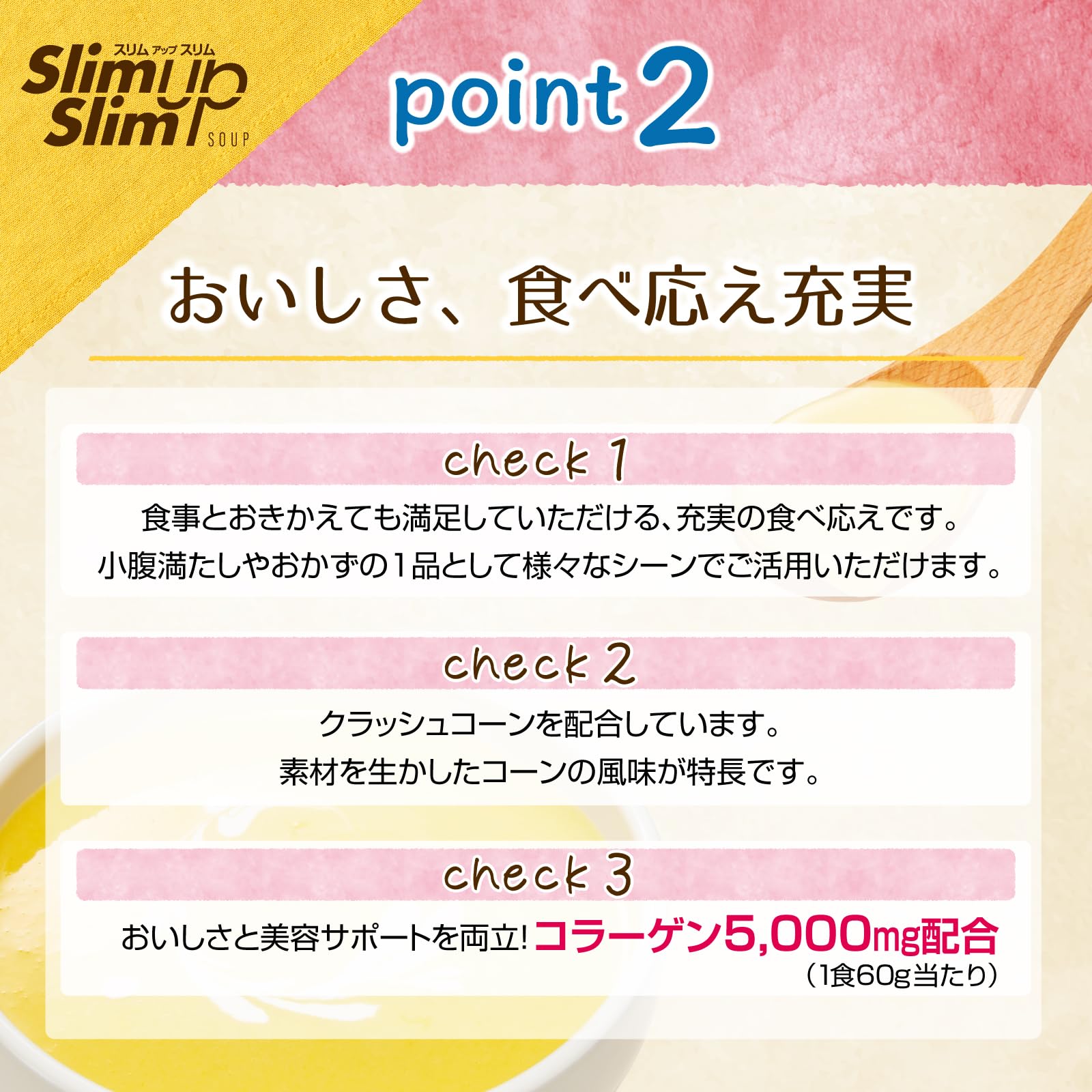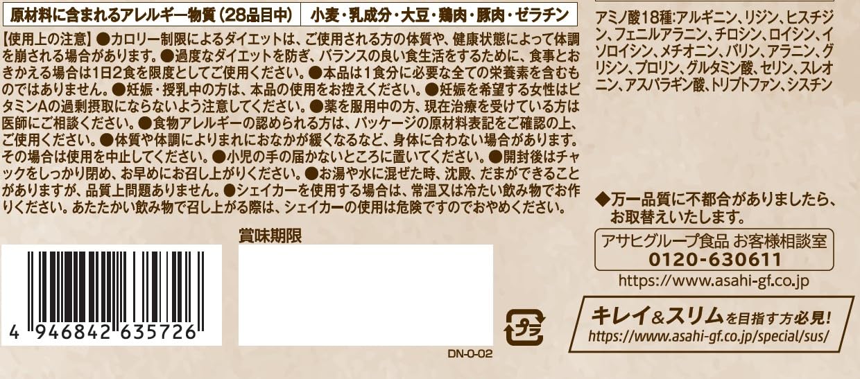 原材料・成分:乳蛋白(フランス製造、デンマーク製造)、大豆蛋白、水溶性食物繊維、コーンパウダー、豚コラーゲンペプチド(ゼラチンを含む)、脱脂粉乳、食塩、でん粉、チキンエキスパウダー(小麦を含む)、ドロマイト、オニオンエキスパウダー、パン酵母末、チーズ加工品、たん白加水分解物(豚肉を含む)、食用油脂、乳等を主要原料とする食品、酵母エキス末、香辛料、殺菌乳酸菌末、具(乾燥コーン)/調味料(アミノ酸等)、クエン酸K、グルコン酸K、糊料(キサンタン)、乳化剤、香料、V.C、クチナシ色素、甘味料(スクラロース、アセスルファムK、カンゾウ)、V.E、ピロリン酸第二鉄、パントテン酸Ca、V.A、酸味料、ナイアシン、V.B6、V.B1、V.B2、葉酸、V.D、V.B12