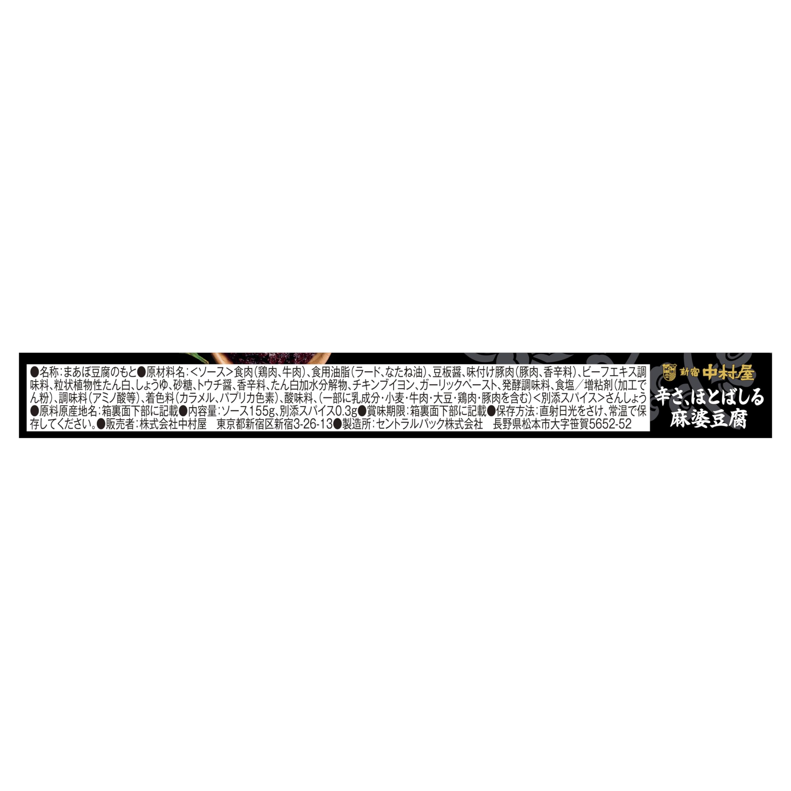 この「新宿中村屋 本格四川 辛さ、ほとばしる麻婆豆腐 155g」は、熟成豆板醤のコク深い辛さと四川山椒の香りと痺れる辛さに挽肉の旨味が調和した、ほとばしる辛さが特徴の本格四川麻婆豆腐ソースになっております。【原材料】ソース/食肉(豚肉、鶏肉、牛肉)、食用油脂(なたね油、ラード)、豆板醤、しょうゆ、香辛料、粒状植物性たん白、砂糖、魚醤、発酵調味料、ビーフエキス、豆豉、ポークブイヨン、増粘剤(加工でん粉、増粘多糖類)、調味料(アミノ酸等)、着色料(カラメル、パプリカ色素、紅麹)、(原材料の一部に乳成分、小麦を含む)別添スパイス/さんしょう