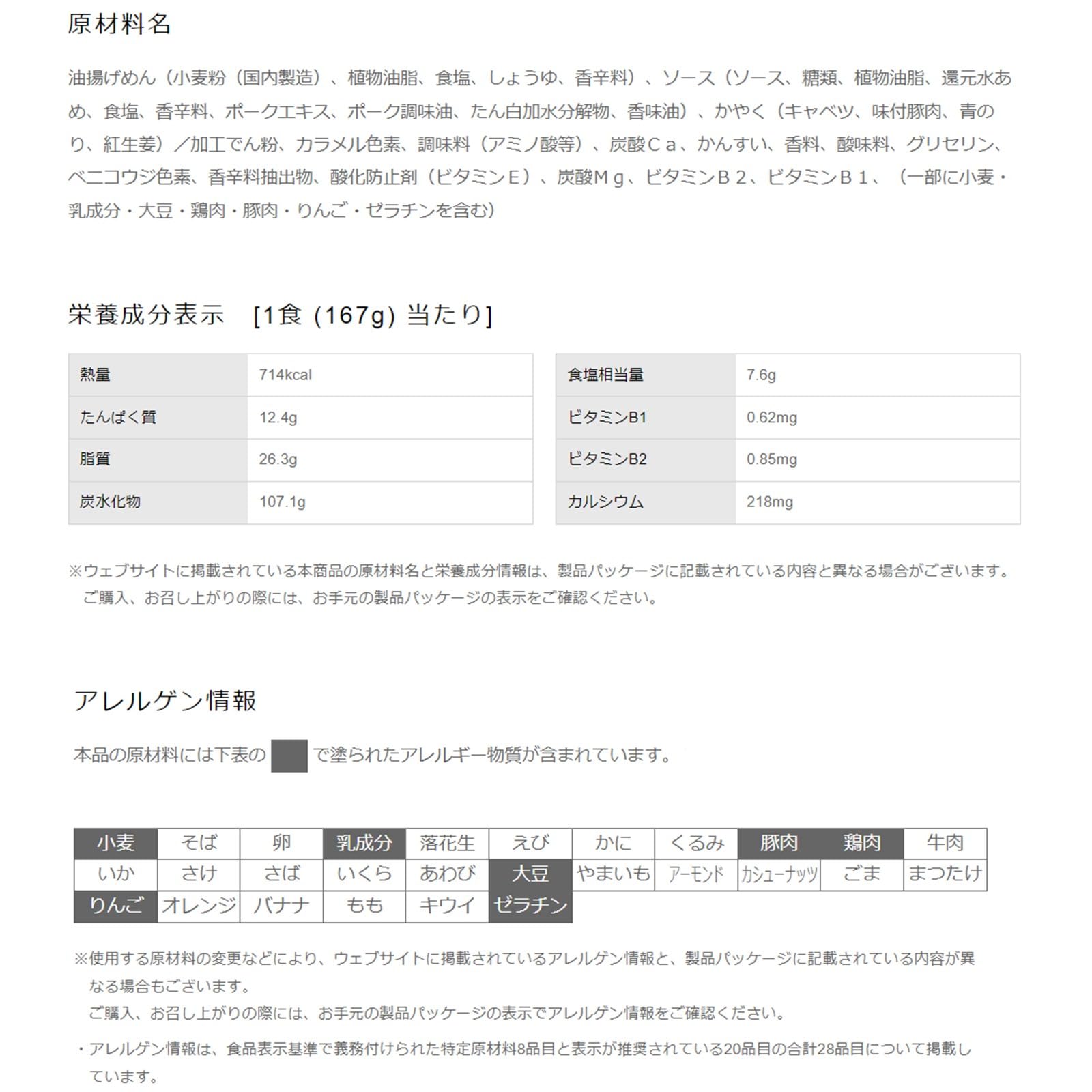 原材料:油揚げめん(小麦粉、植物油脂、食塩、しょうゆ、香辛料)、ソース(ソース、糖類、植物油脂、還元水あめ、食塩、香辛料、ポークエキス、ポーク調味油、たん白加水分解物、香味油)、かやく(キャベツ、味付豚肉、青のり、紅生姜)/加工でん粉、カラメル色素、調味料(アミノ酸等)、炭酸Ca、かんすい、香料、酸味料、グリセリン、ベニコウジ色素、香辛料抽出物、酸化防止剤(ビタミンE)、炭酸Mg、ビタミンB2、ビタミンB1、(一部に小麦・乳成分・大豆・鶏肉・豚肉・りんご・ゼラチンを含む)