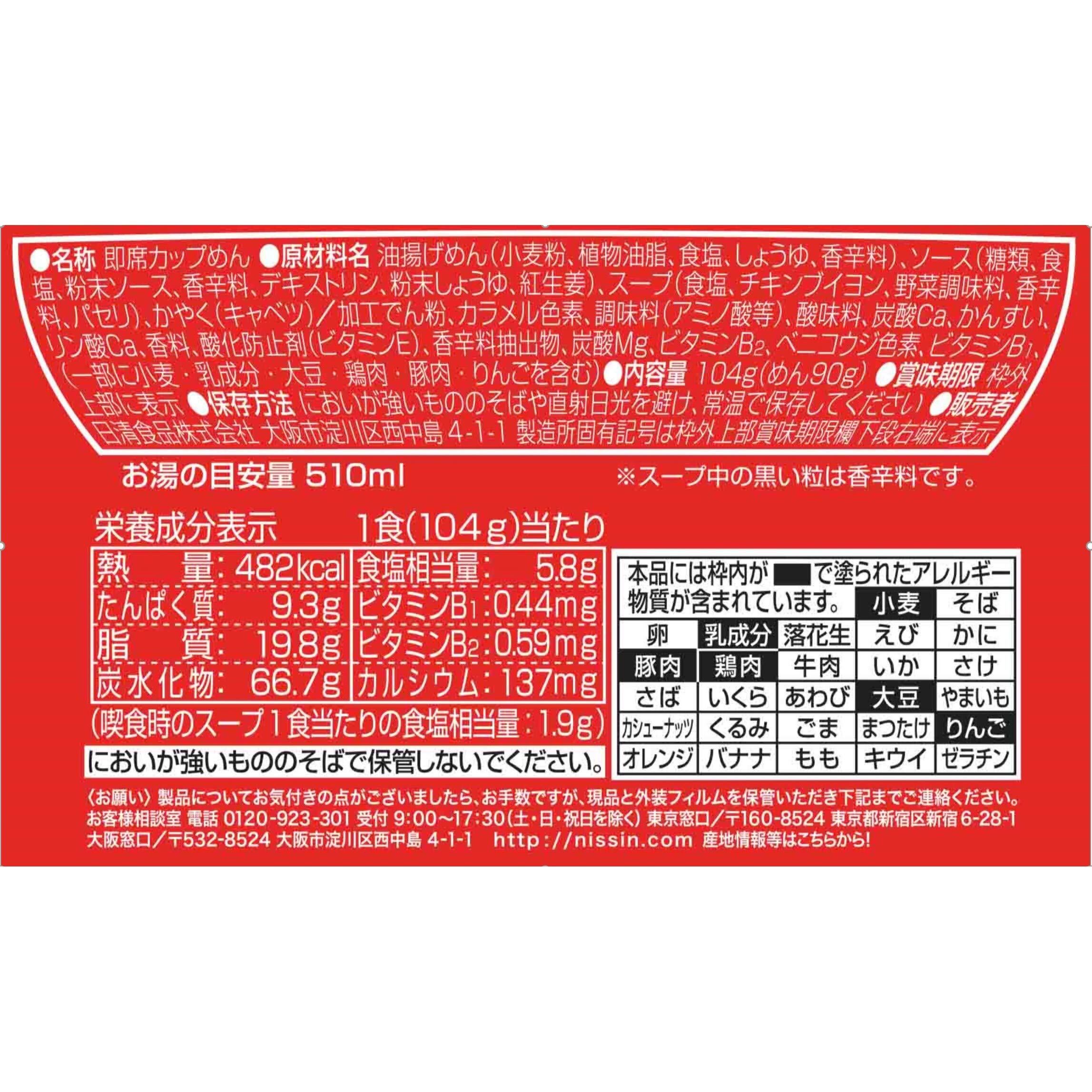 あったかうれしい "もう一品" が付いて、満足度アップ! 紅ショウガの入ったスパイシーなソースが決め手の手軽に楽しめるカップ焼そば。麺を戻すために使用したお湯で手軽に作ることができる「チキンスープ」を付けました。チキンとオニオンのうまみをきかせ、パセリをアクセントに加えた「チキンスープ」は、スパイシーな味わいの焼そばとも相性が抜群です。(104g当たり)エネルギー:482kcal、たんぱく質:9.3g、脂質:19.8g、炭水化物:66.7g、食塩相当量:5.8g、ビタミンB1:0.44mg、ビタミンB2:0.59mg、カルシウム:137mg