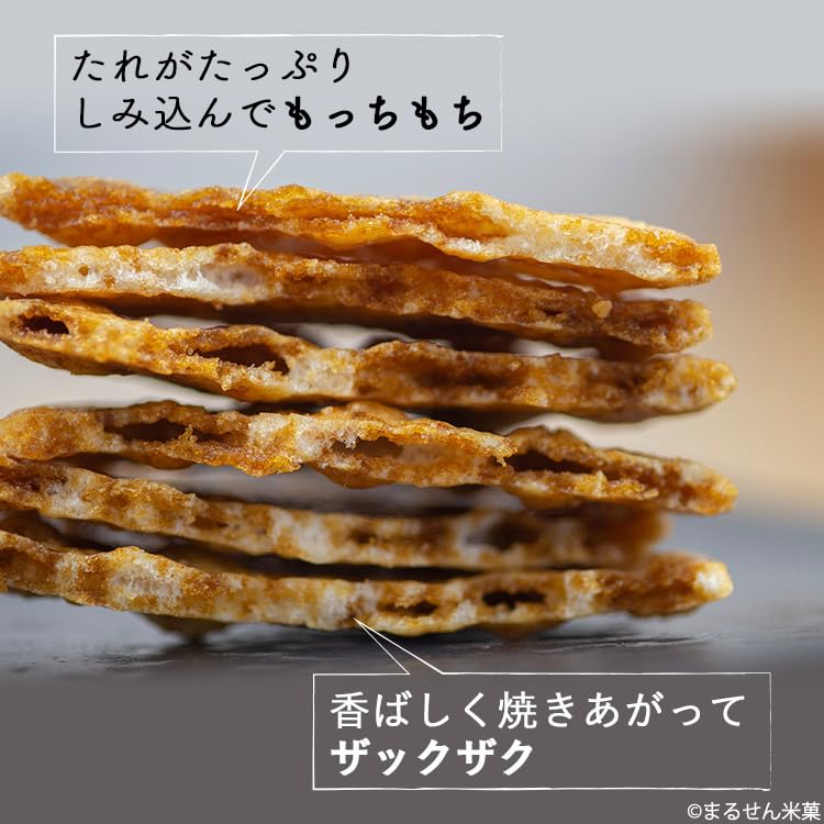 お煎餅に丸大豆醤油を使用のあっさりとした甘口のタレを染み込ませ、香ばしくザクザクした食感と、タレが染みてもちもちした食感のお煎餅を、無選別で包装しました。