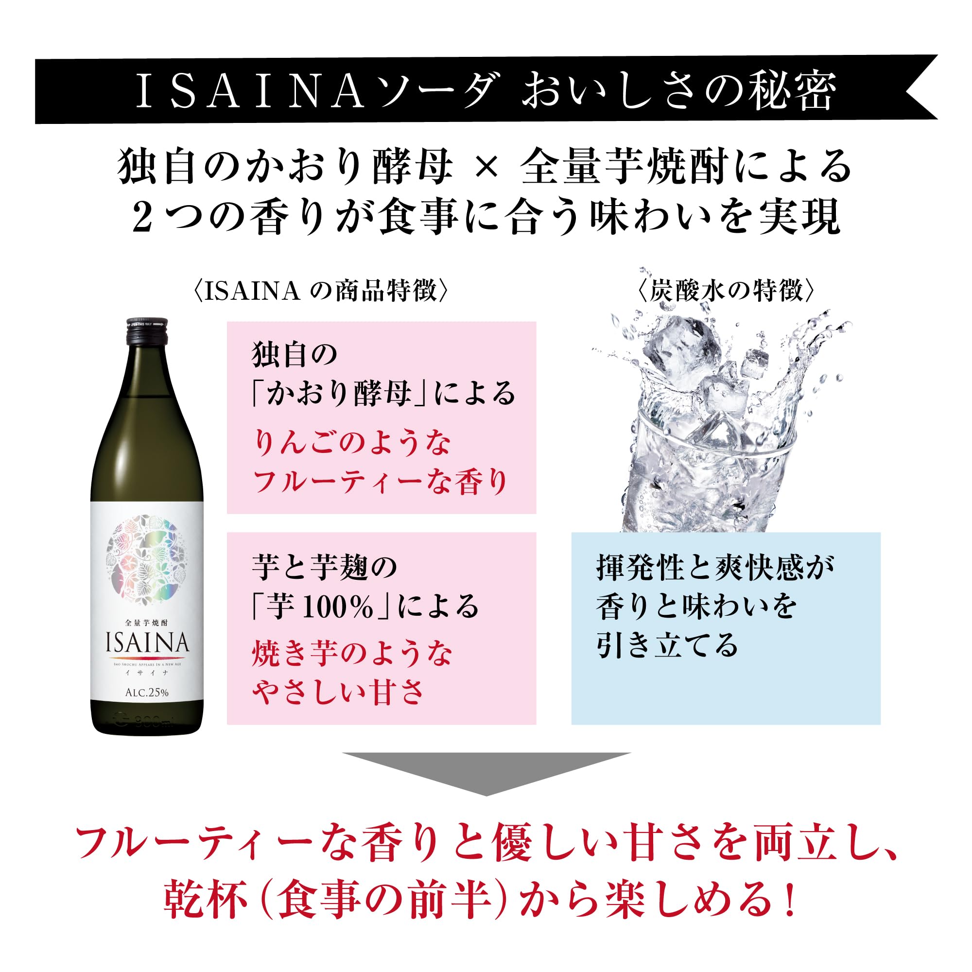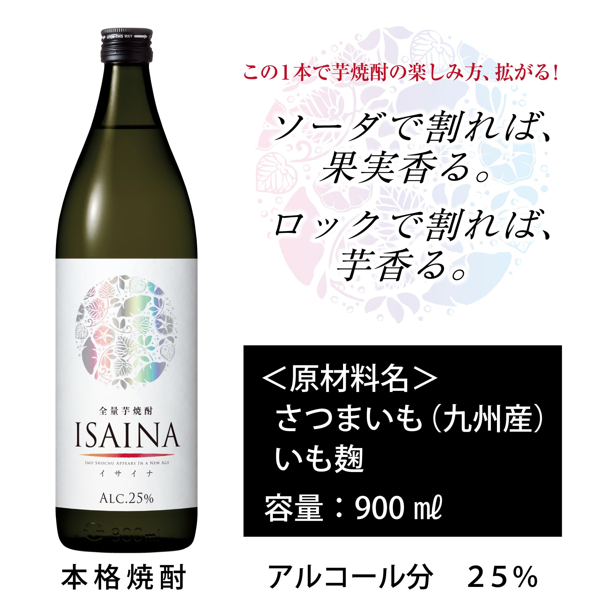 飲み方で香りが変わるから、色んなシーンで芋焼酎が楽しめる、今までなかった“異才な"全量芋焼酎です。独自のかおり酵母と芋麹仕込で、炭酸割りとロック両方のおいしさを両立しました。炭酸割りではリンゴのようなフルーティな香り、ロックでは焼き芋のようなほっこり甘い香りで様々なシーンで楽しむことができます。 原材料・成分 さつまいも(九州産)、いも麹