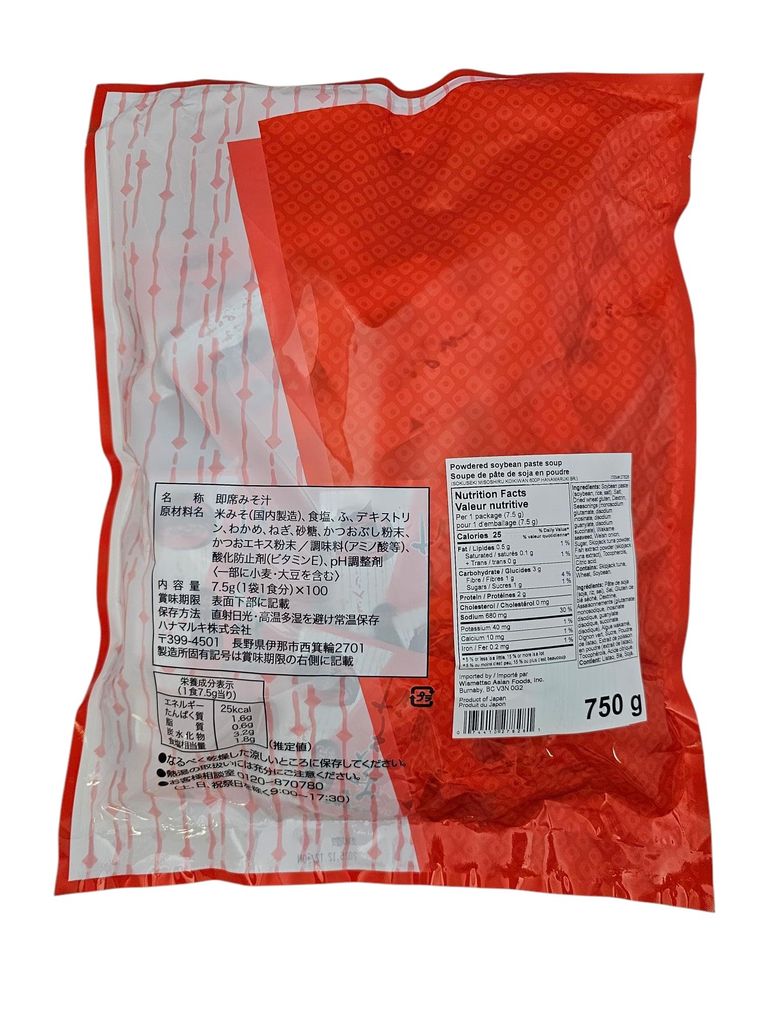 米みそ、食塩、ふ、デキストリン、わかめ、ねぎ、砂糖、かつおぶし粉末、かつおエキス粉末、調味料(アミノ酸等)、酸化防止剤(ビタミンE)、pH調整剤、(原材料の一部に小麦を含む)