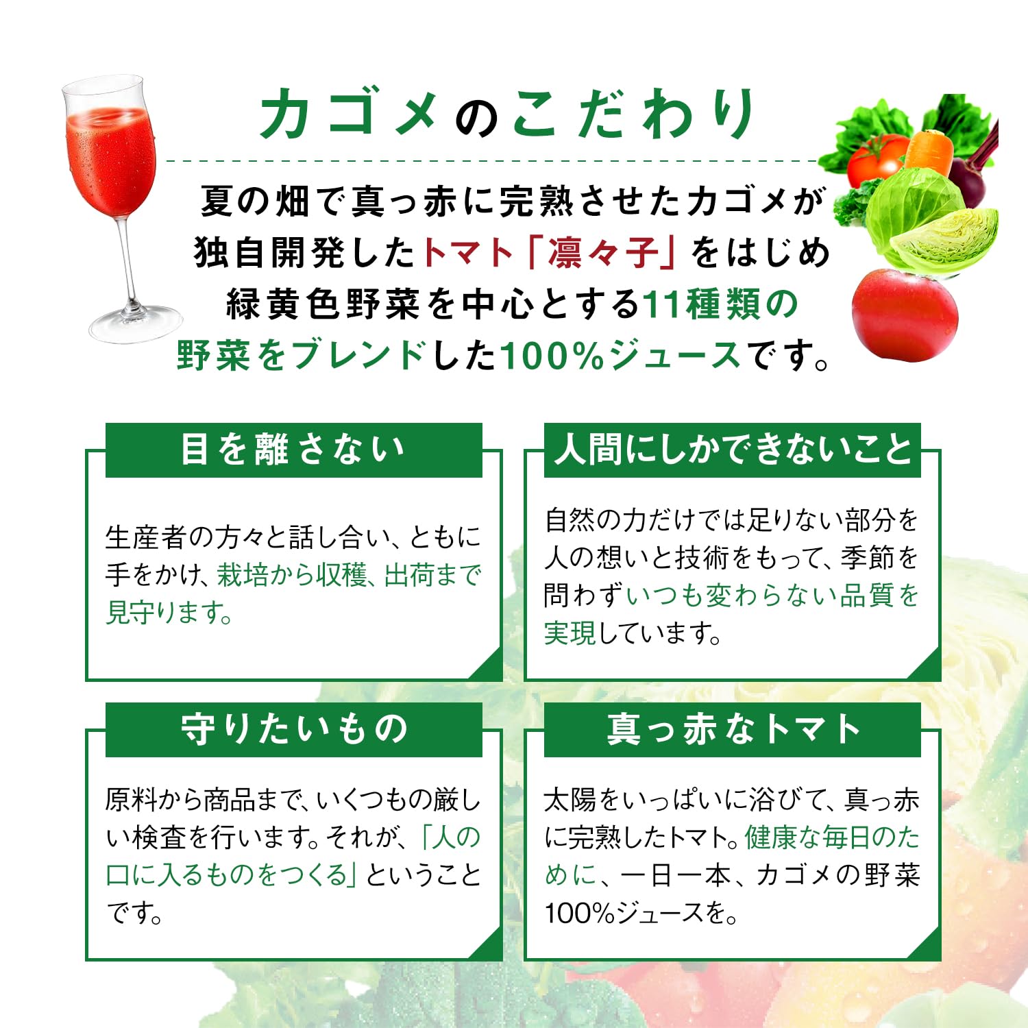 原材料:トマトジュース(濃縮トマト還元)、野菜ジュース(セロリ・にんじん・ビート・パセリ・レタス・キャベツ・ほうれん草・クレソン・メキャベツ(プチヴェール)(濃縮還元)、にんにく)、レモン果汁/香辛料