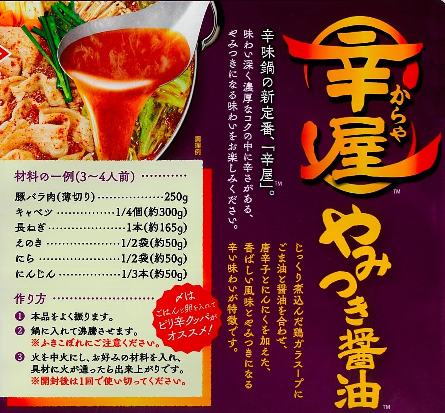 味わい深く濃厚なコクの中に辛さがある、辛み鍋つゆ(辛鍋・鍋の素・鍋スープ・なべつゆ)シリーズです。じっくり煮込んだ鶏がらスープにごま油と醤油を合わせ、唐辛子とにんにくと加えた、香ばしい風味とやみつきになる辛い味わいが特徴です。使い切りパウチ容器使用の3~4人前750g入り、ストレートタイプです。