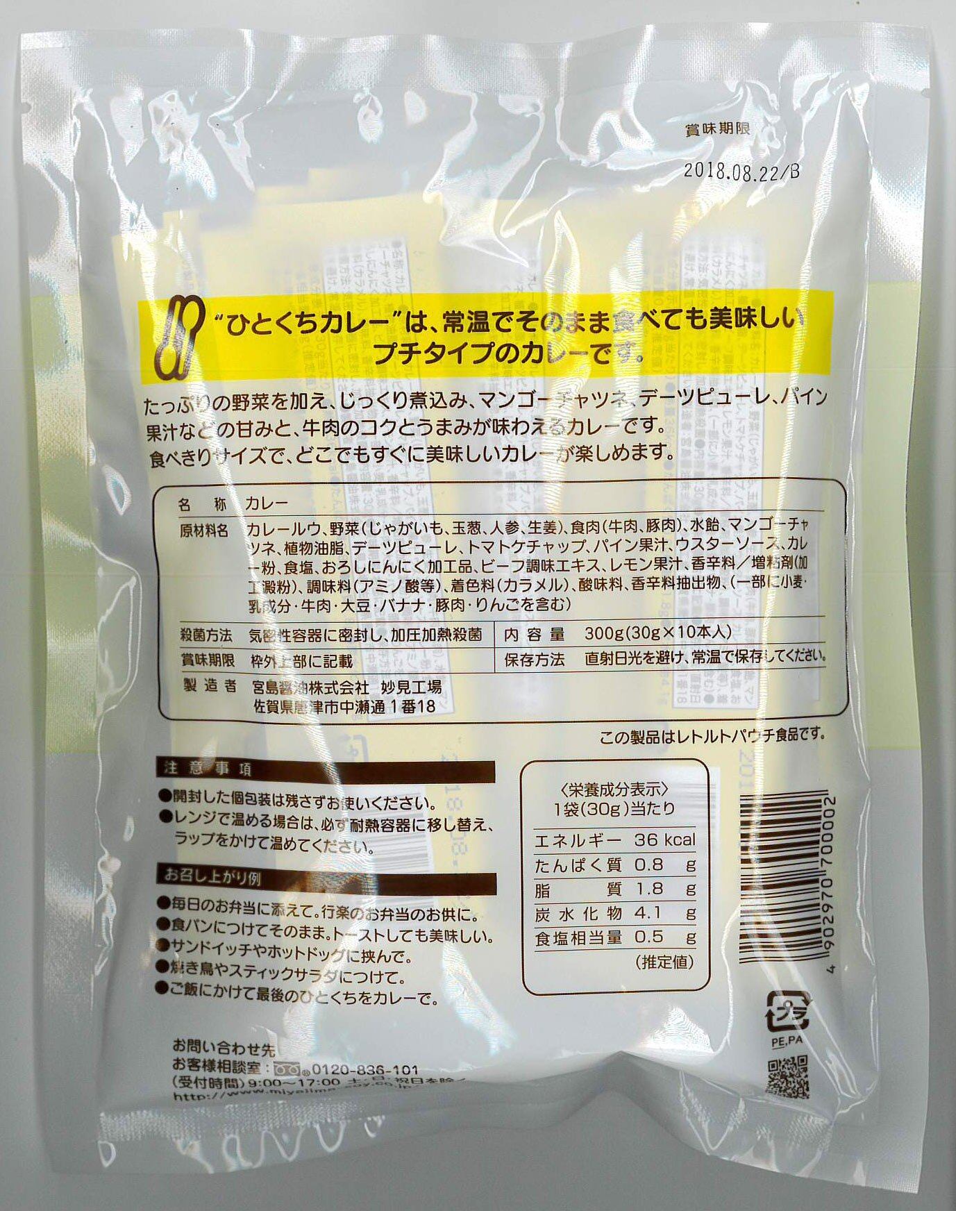 原材料:野菜・果実(じゃがいも、玉葱、人参、デーツ、にんにく、生姜)、カレールウ、食肉(牛肉、豚肉)、水飴、マンゴーチャツネ、植物油脂、トマトケチャップ、パイン果汁、ウスターソース、食塩、ビーフエキス、レモン果汁、香辛料、蛋白加水分解物、増粘剤(加工澱粉)、調味料(アミノ酸等)、着色料(カラメル)、酸味料、(原材料の一部に乳成分、小麦、大豆、バナナ、りんご含む)