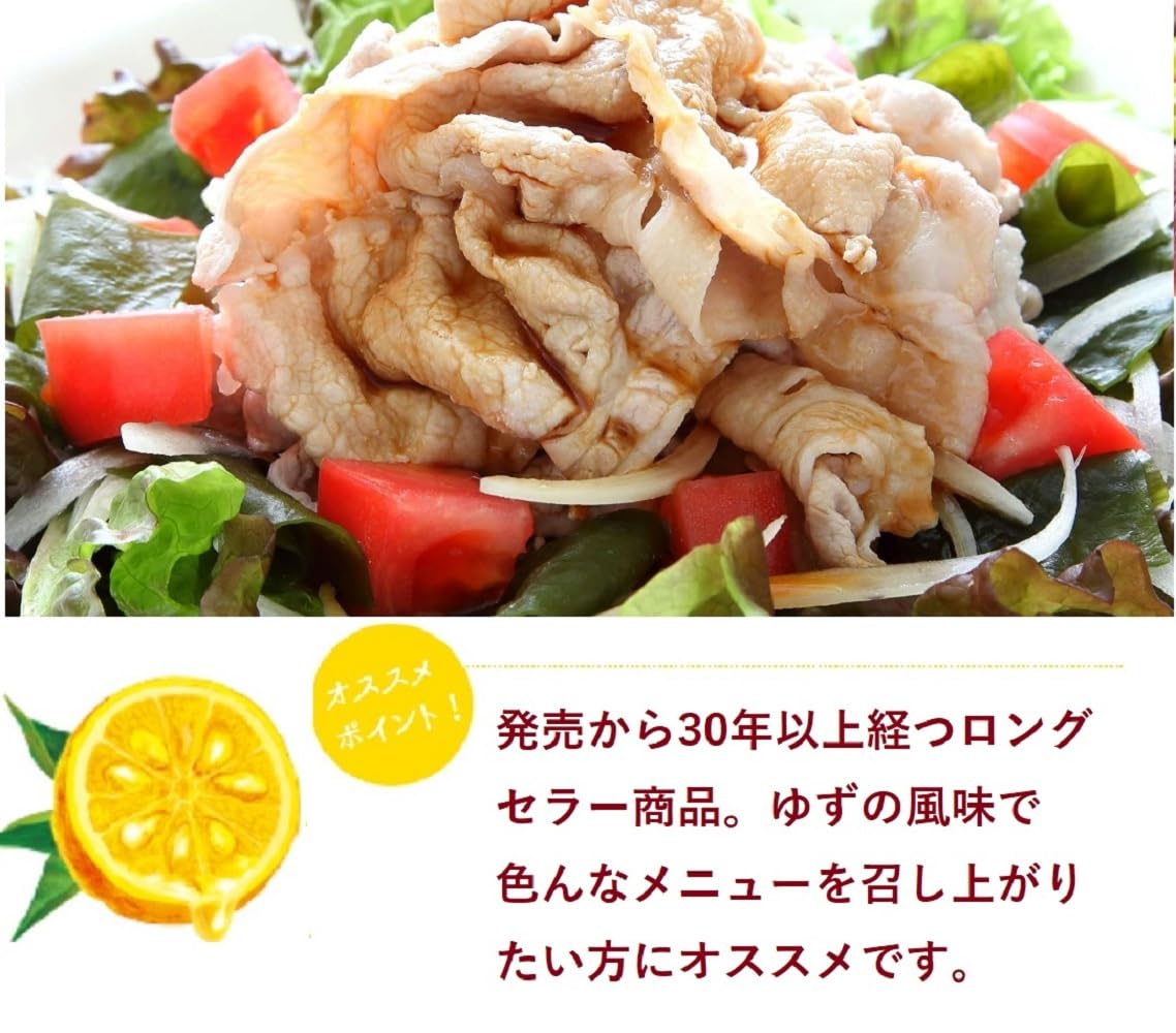 原材料:本醸造しょうゆ(小麦・大豆を含む)、果糖ぶどう糖液糖、醸造酢、ゆず果汁、食塩、昆布だし/調味料(アミノ酸等)、酸味料