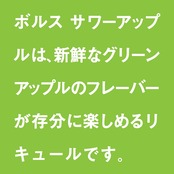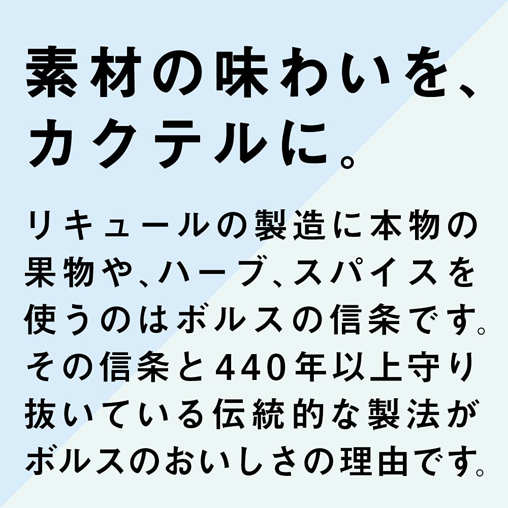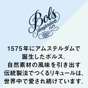 1575年にルーカス・ボルスによってアムステルダムで誕生した「ボルス」。果汁をはじめとした天然材料から生まれる高い品質とバーテンディングへの様々なニーズをもとに開発されたボトルデザインは、世界中のプロバーテンダーから高い支持を集めています。甘さと酸味のバランスのとれた、さわやかで香りのよいフレッシュなグリーンアップルリキュールです。シナモンやクッキングアップルのエッセンスがほのかに感じられます。