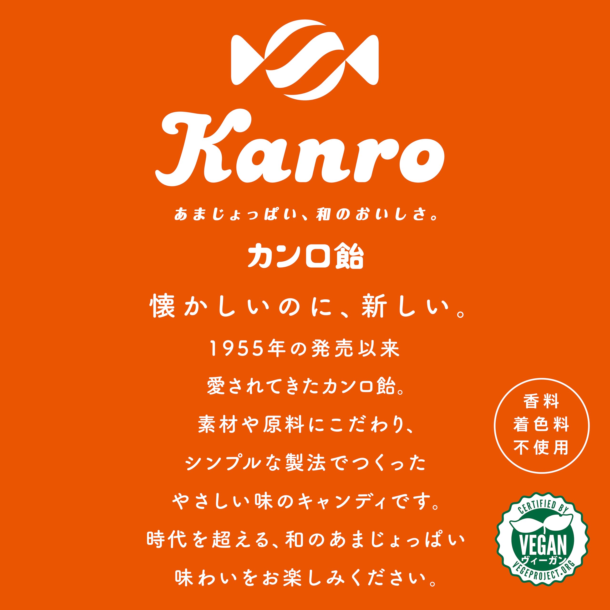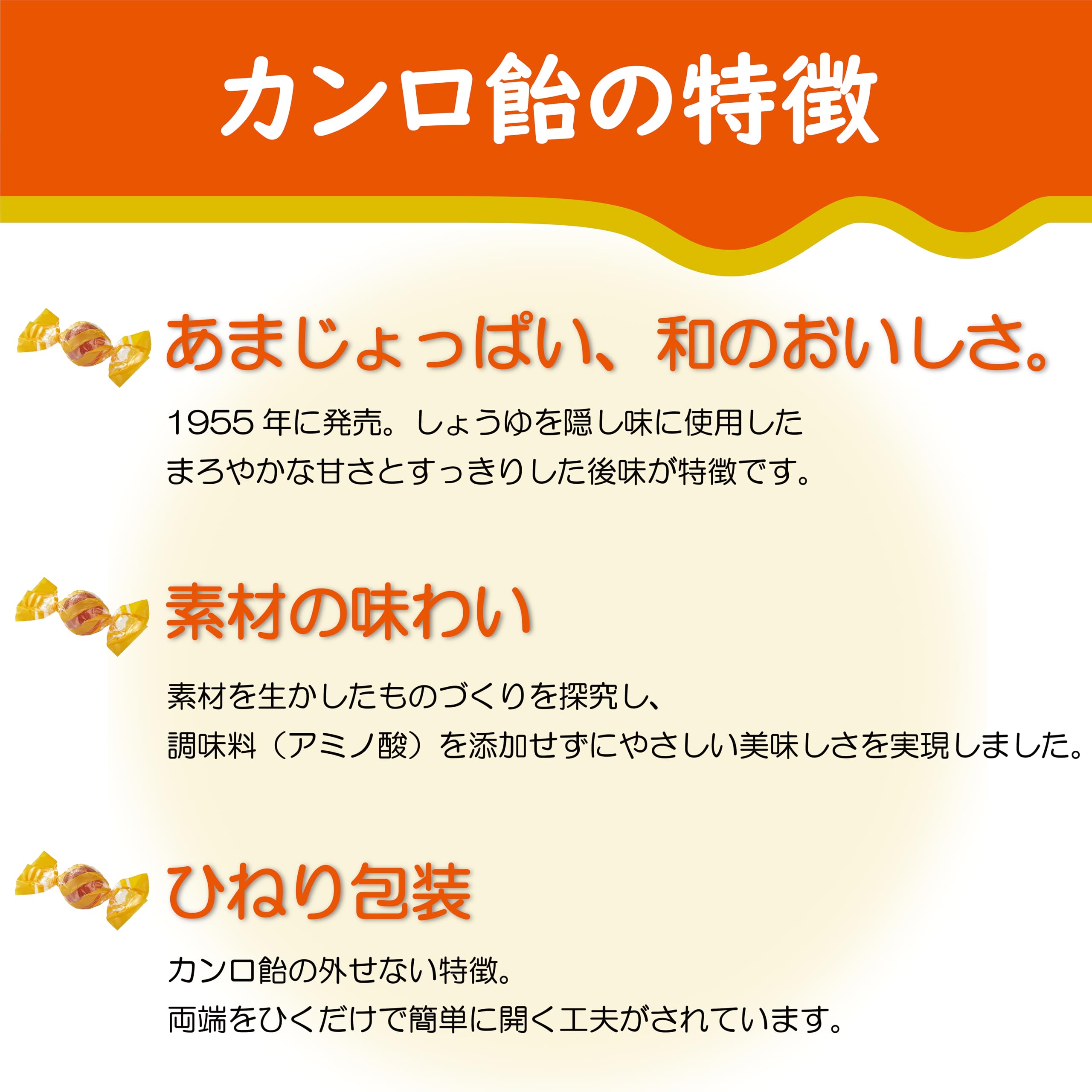 ・おいしさはそのままに、原材料から「調味料(アミノ酸)」をなくし、「砂糖、水飴、しょうゆ、食塩」の素材だけで作られたシンプルなおいしさに変更 ・商品のデザインを、新CIに合わせて大幅に刷新。香料着色料不使用マークと英語表記も追加。 ・包材のバリア性を高め、飴のべたつきを低減 ・あまじょっぱい和のおいしさに、どこか懐かしさを感じてほっとする日本の伝統的な飴 ・香料、着色料不使用 ・独特の旨みを持つ、特別に醸造したカンロ飴専用醤油を使用 ・お買い得徳用サイズ