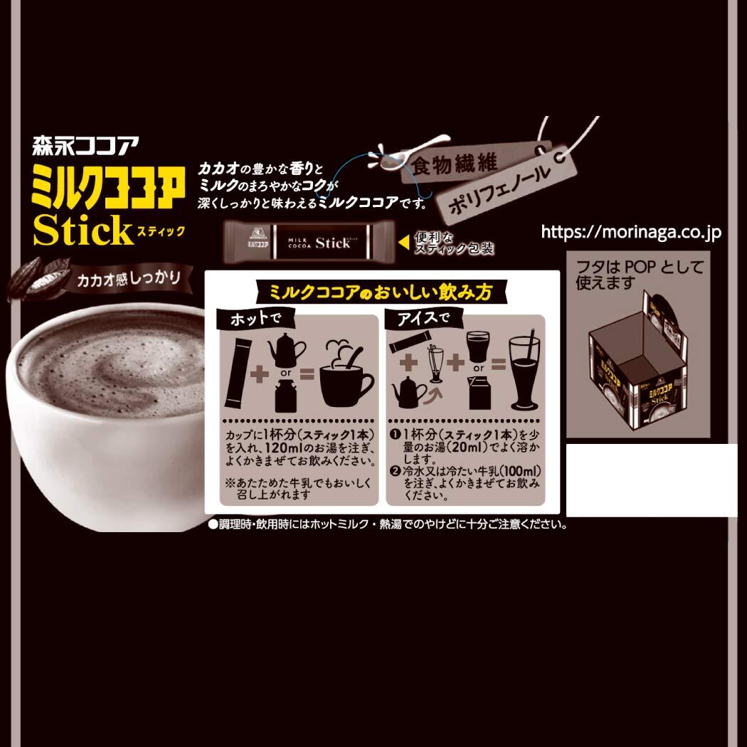 ●幅広い方に親しまれる定番ミルクココア。●カカオの豊かな香りとミルクのまろやかなコクが深くしっかりと味わえるミルクココアです。●便利なスティック包装で計量不要●お徳な大容量80本入り。家庭でも会社でもご利用いただくのに便利です●ホットでもアイスでも美味しくお召しあがりいただけます。