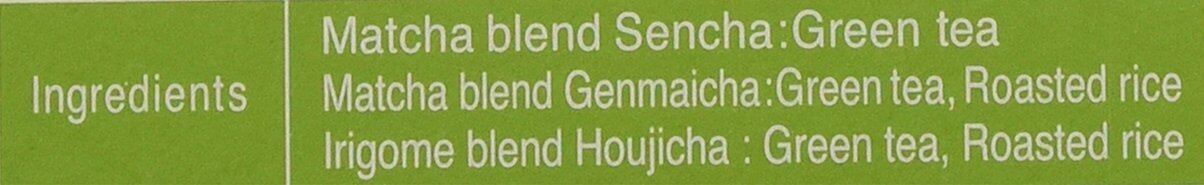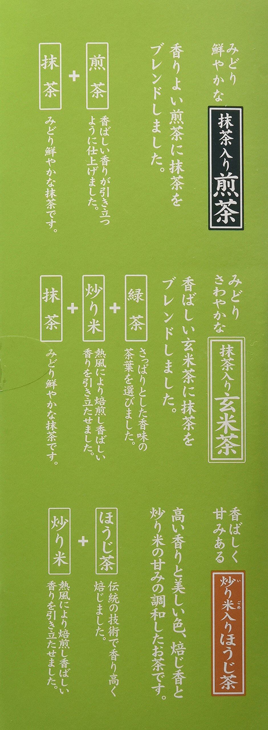 伊右衛門の抹茶入り煎茶・抹茶入り玄米茶・炒り米入りほうじ茶の入ったアソートティーバッグです。