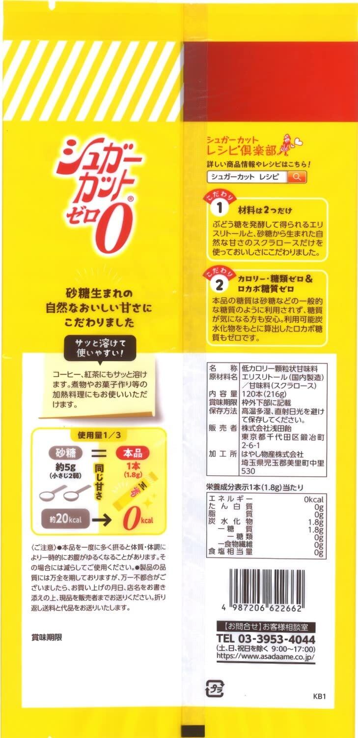 カロリーゼロの甘味料です。使用量は砂糖の1/3と経済的です。ぶどう糖を発酵して得られるエリスリトールと、砂糖から生まれた自然な甘さのスクラロースだけを使っておいしさにこだわった甘味料です。シュガーカットゼロ顆粒の糖質は砂糖などの一般的な糖質のように利用されず、糖質が気になる方にも安心です。利用可能炭水化物をもとに算出したロカボ糖質もゼロです。