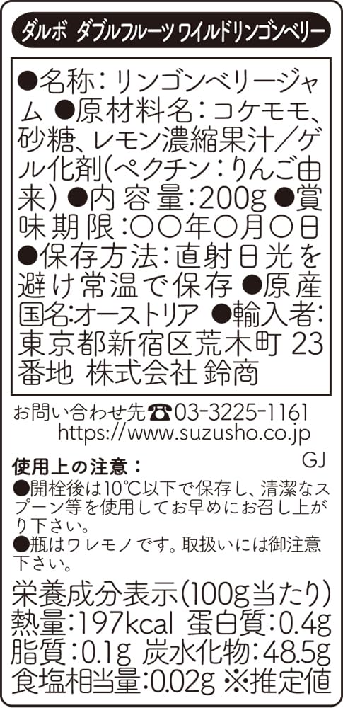 コケモモ、砂糖、レモン濃縮果汁、ゲル化剤(ペクチン「リンゴ由来」)