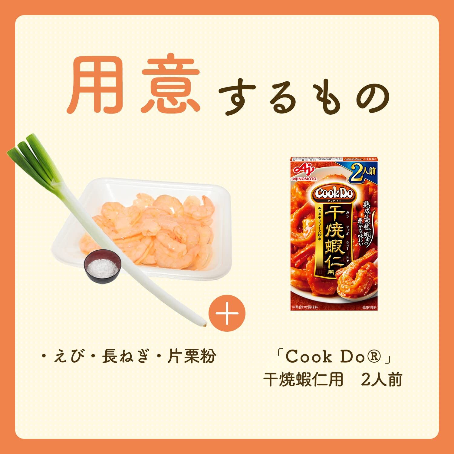 1.下ごしらえ ・えび:からをむき、背ワタをとり水気をふき取って、片栗粉小さじ2をまぶす。 ・長ねぎ:みじん切り 2.えびを炒める(弱火) ・熱したフライパンに油大さじ1を入れ、えびに火が通るまで弱火で炒める。 3.「CookDo」とねぎを入れる(中火) ・火を止め、「CookDo」とねぎを入れた後、再び火をつけ、炒め合わせて出来上がり。