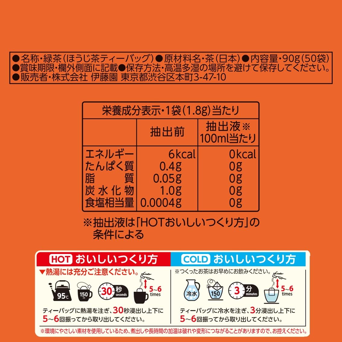 栄養成分(1袋(1.8g)当たり)[抽出前]:エネルギー:6kcal、たんぱく質:0.4g、脂質:0.05g、炭水化物:1.0g、食塩相当量:0.0004g [抽出液※ 100ml当たり]:エネルギー:0kcal、たんぱく質:0g、脂質:0g、炭水化物:0g、食塩相当量:0g ※抽出液は「HOTおいしい作り方」の条件による