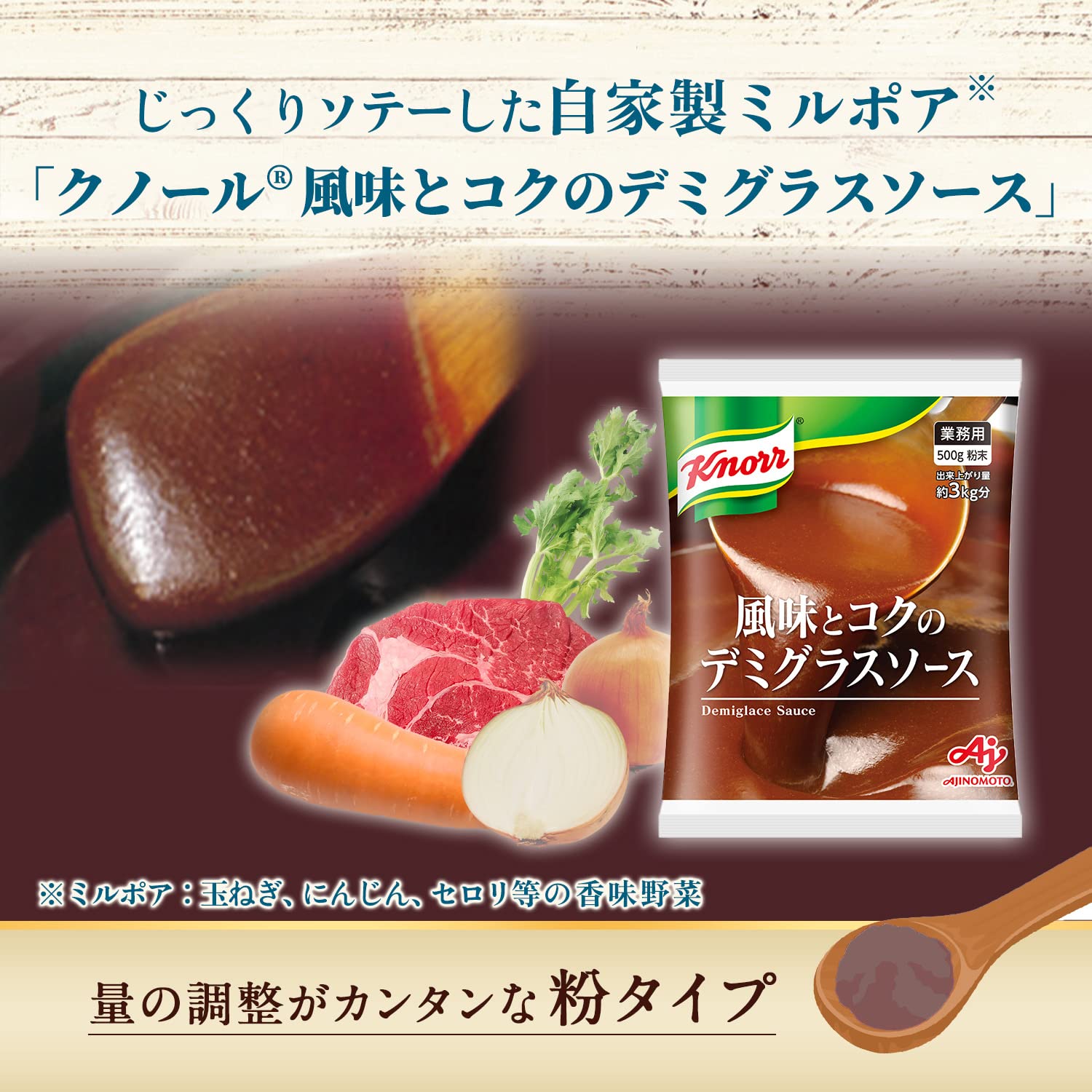 じっくりソテーした自家製ミルポア※の香ばしい風味とビーフのコクをとじ込めた、豊かな味わいのデミグラスソース です(※ミルポア:玉ねぎ、にんじん、セロリ等の香味野菜)。