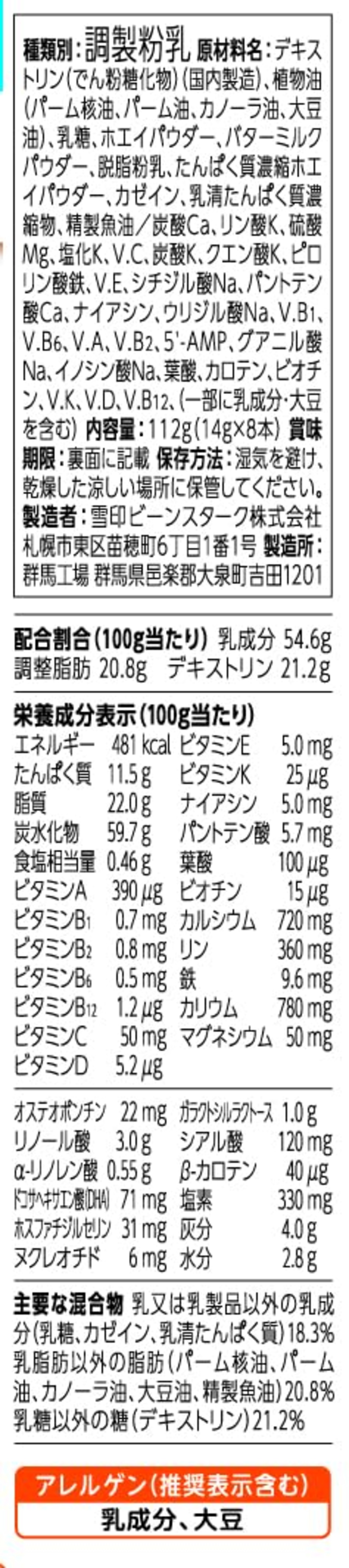 デキストリン(でん粉糖化物)(国内製造)、植物油(パーム核油、パーム油、カノーラ油、大豆油)、乳糖、ホエイパウダー、バターミルクパウダー、脱脂粉乳、たんぱく質濃縮ホエイパウダー、カゼイン、乳清たんぱく質濃縮物、精製魚油/炭酸Ca、リン酸K、硫酸Mg、塩化K、V.C、炭酸K、クエン酸K、ピロリン酸鉄、V.E、シチジル酸Na、パントテン酸Ca、ナイアシン、ウリジル酸Na、V.B1、V.B6、V.A、V.B2、5'-AMP、グアニル酸Na、イノシン酸Na、葉酸、カロテン、ビオチン、V.K、V.D、V.B12、(一部に乳製分・大豆を含む)