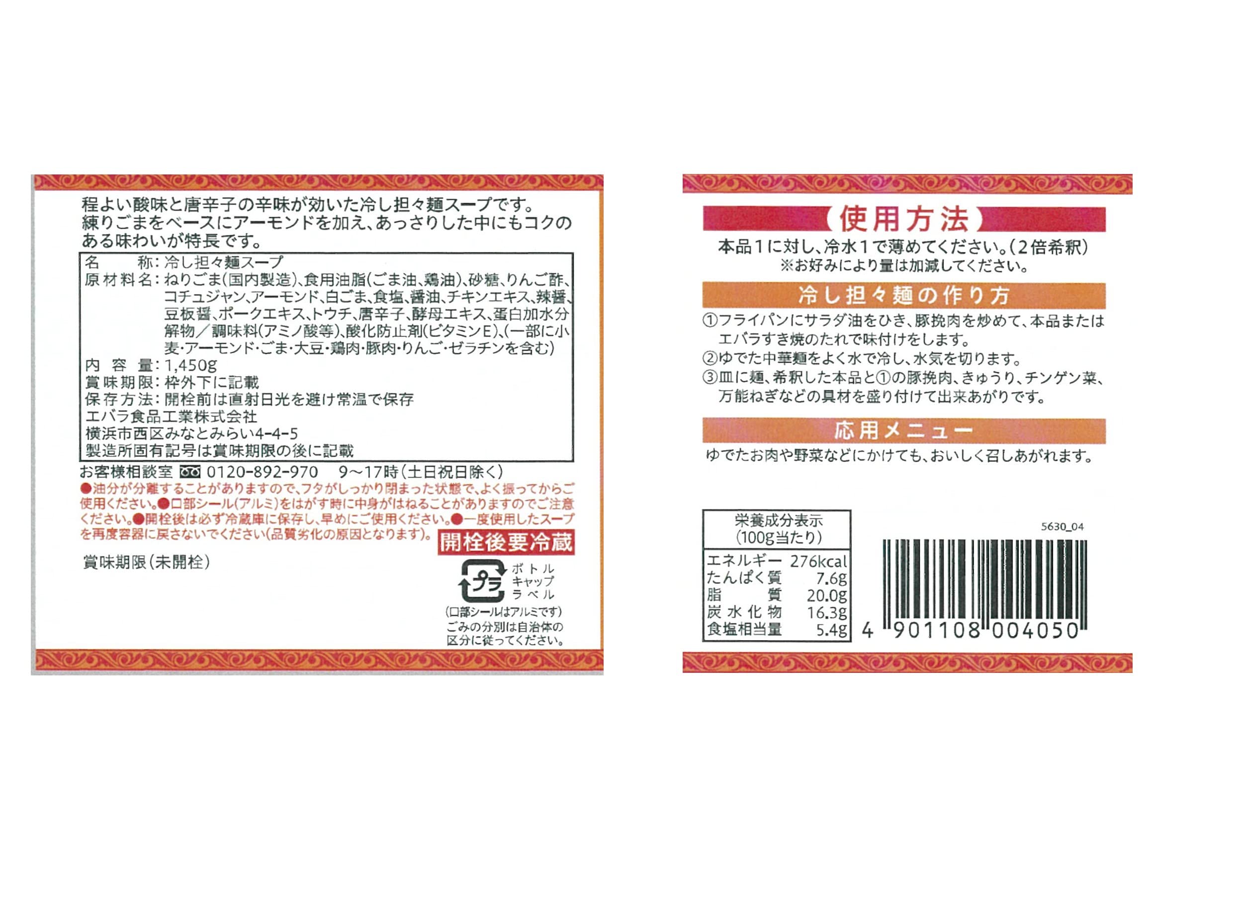 【冷し担々麺スープ】練りごまを使用しアーモンドを加え、あっさりした中にもコクのある味わいが特徴の坦々麺スープです。またほどよい酸味と唐辛子の辛味が効いた冷し用の担々麺スープです。スープのほか、茹でたお肉や野菜などにかけても、おいしく召しあがれます。本品1に対し、冷水1で薄めてください。※お好みにより量は加減してください。