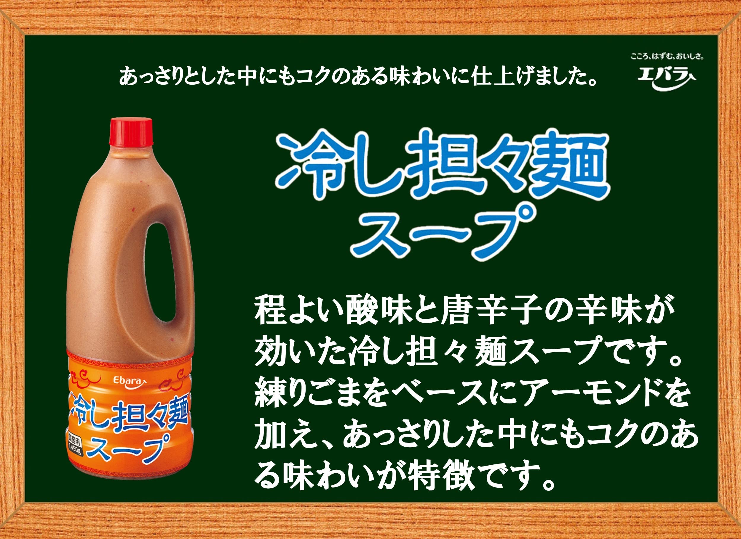 程よい酸味と唐辛子の辛味が効いた冷し担々麺スープです。練りごまをベースにアーモンドを加え、あっさりした中にもコクのある味わいが特徴です。