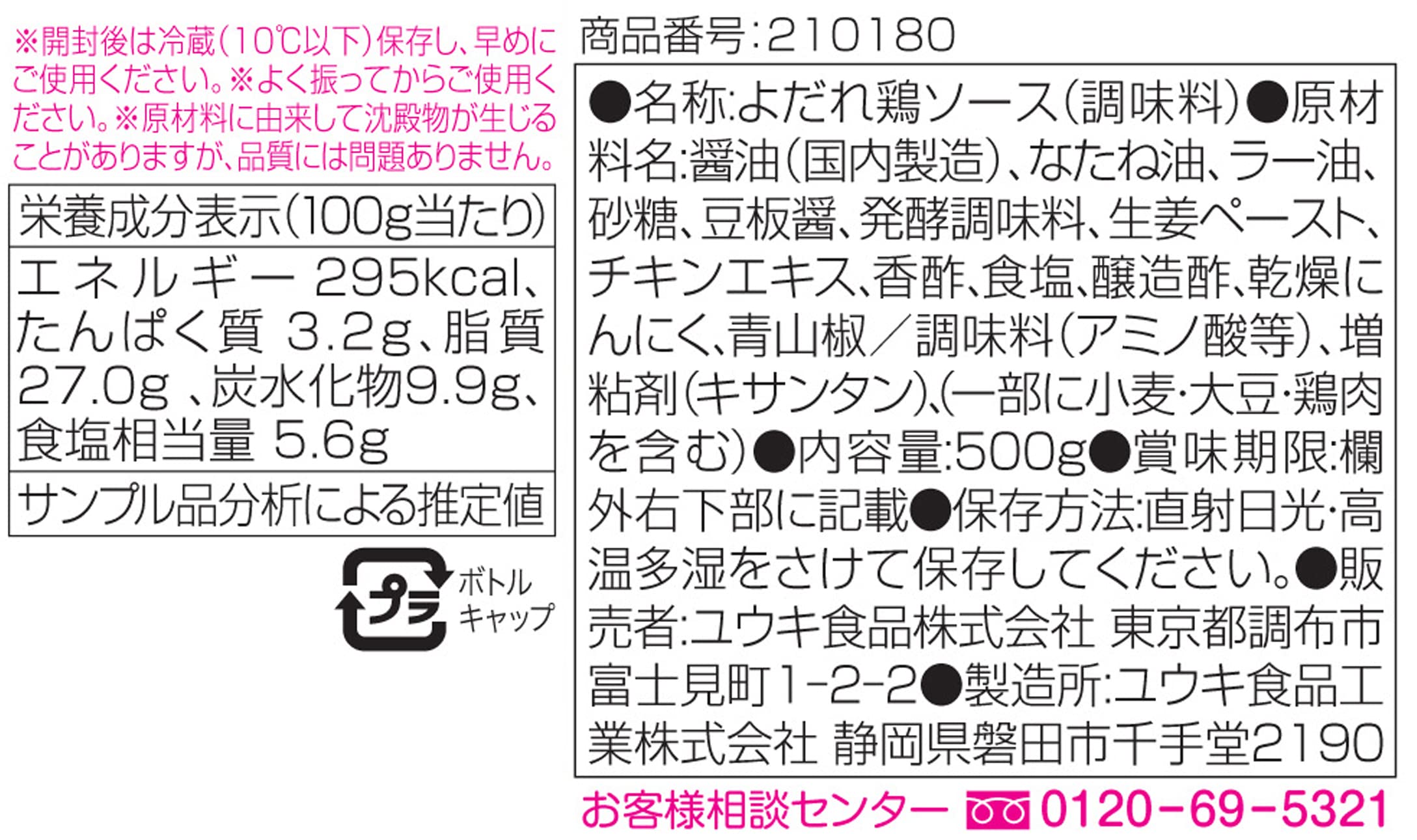 原材料:醤油(国内製造)、なたね油、ラー油、砂糖、豆板醤、発酵調味料、生姜ペースト、チキンエキス、香酢、食塩、醸造酢、乾燥にんにく、青山椒/調味料(アミノ酸等)、増粘剤(キサンタン)、(一部に小麦・大豆・鶏肉を含む)