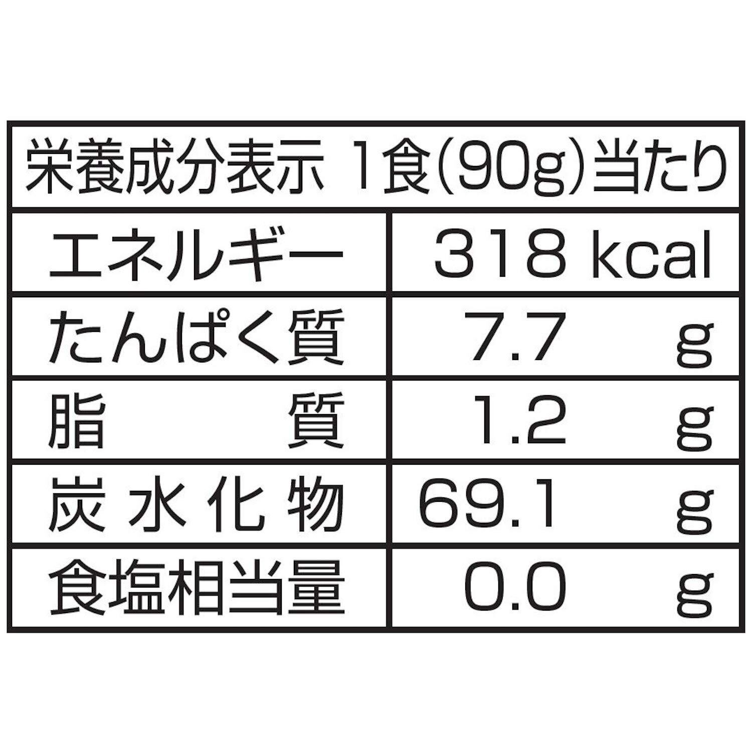 栄養成分表示1食(90g)当たり エネルギー318kcal たんぱく質7.7g 脂質1.2g 炭水化物69.g 食塩相当量0.0g