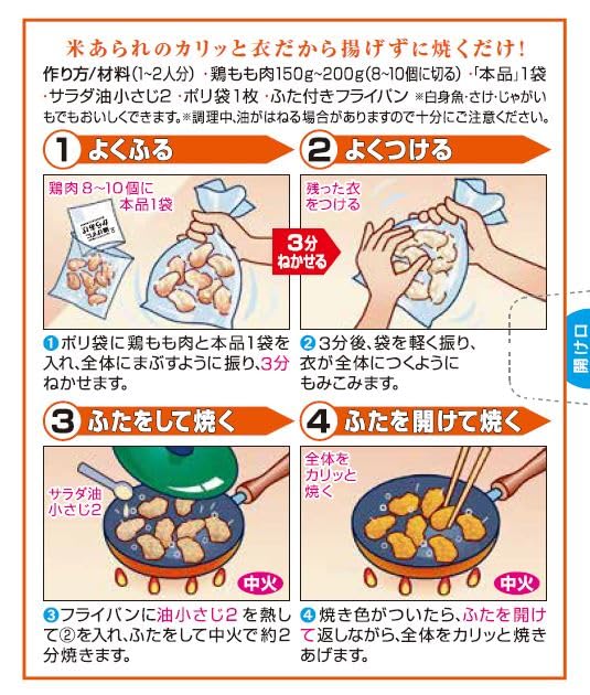 鶏もも肉にまぶしてフライパンで焼くだけでからあげが出来ます(1袋で、鶏もも肉150g~200g)。粉末うすくちしょうゆの香ばしさと、スパイスの風味、野菜の甘みが味の決め手です。米あられの特製衣が、肉のうまみを逃さず、カリッとジューシーに仕上げます。オーブンでも、揚げてもおいしくできます。